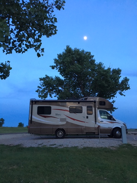 After this fiasco, we did a little further research on the next campground that we had booked and realized that the reviews were not terribly encouraging. (Avoid TripleJ RV Park) So after some research, we found Wilson State Park in Russel County, Kansas. Wilson Lake is a 9000 acre man- made reservoir that was created by the Tennessee Valley Authority (TVA) for flood control of the Saline River. Due to all of the recent rain, at least half of this park was underwater so many campsites were closed. However, we found this park to be a gem in the flat country of Central Kansas. It is only 5 miles off of the interstate, but features rolling hills, a pristine lake, boating, swimming and both primitive camping (no hook-ups) or full hook-up camping. (This is often referred to as FHU in the literature and includes electric, water and sewer connections) We found this park to be so beautiful and relaxing that we stayed an extra night. During the second night, however, we were hit with an incredible lightning, rain and wind storm that quite frankly kept us up till after 2 a.m. until it calmed enough that we were able to sleep. We spoke with several tent campers in the morning who ended up with broken tent poles and huddled in their cars during the storms that raged for hours. The winds in that region of the country can spawn tornadoes and being aware of the conditions and location of storm shelters is advised!!! Note: Tall RV’s rock in the wind.