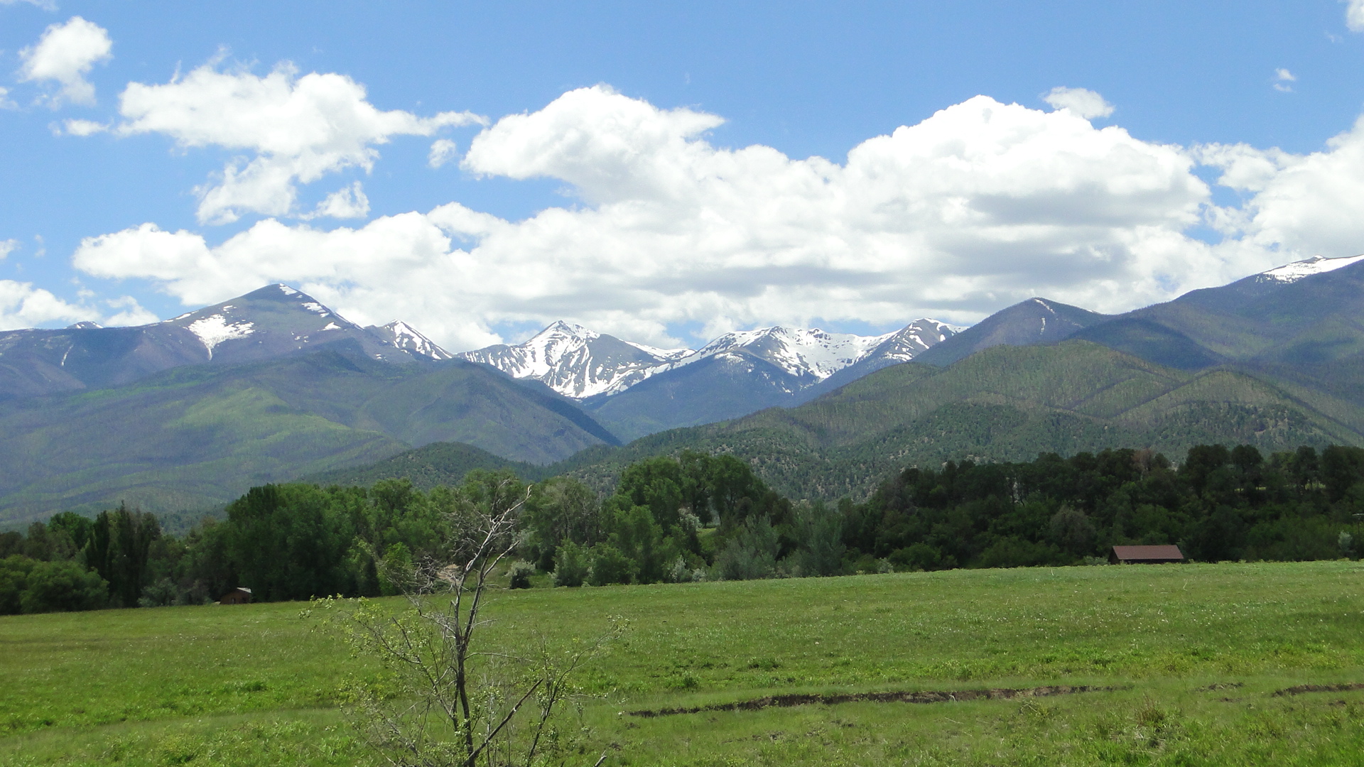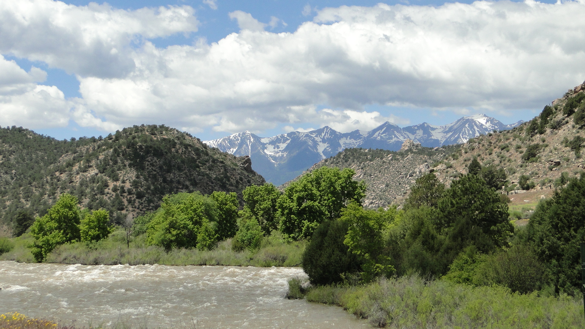Now; of course, what comes up, must come down. The descent to the west is steep, very steep. It is also a gorgeous transition from the eastern slopes of the Rockies. Most of the rain that comes from the Pacific Ocean drops west of the hills or in the mountains, thereby leaving the east side quite arid. The western slopes however; are green and lush, creating an idyllic landscape as you come down from the snow at Monarch Pass. The wide panorama that unfolds as we descend is as dramatic as the upward climb was nerve wracking. The road; however, has dangerous switch backs, steep pitches and sheer cliffs with no guardrails. To the south we can see the southern swing of the continental divide range of snow- capped mountains. The line of the divide meanders quite a bit through Colorado and it is anything but straight, so you will see these imposing mountains at many different angles and locations.