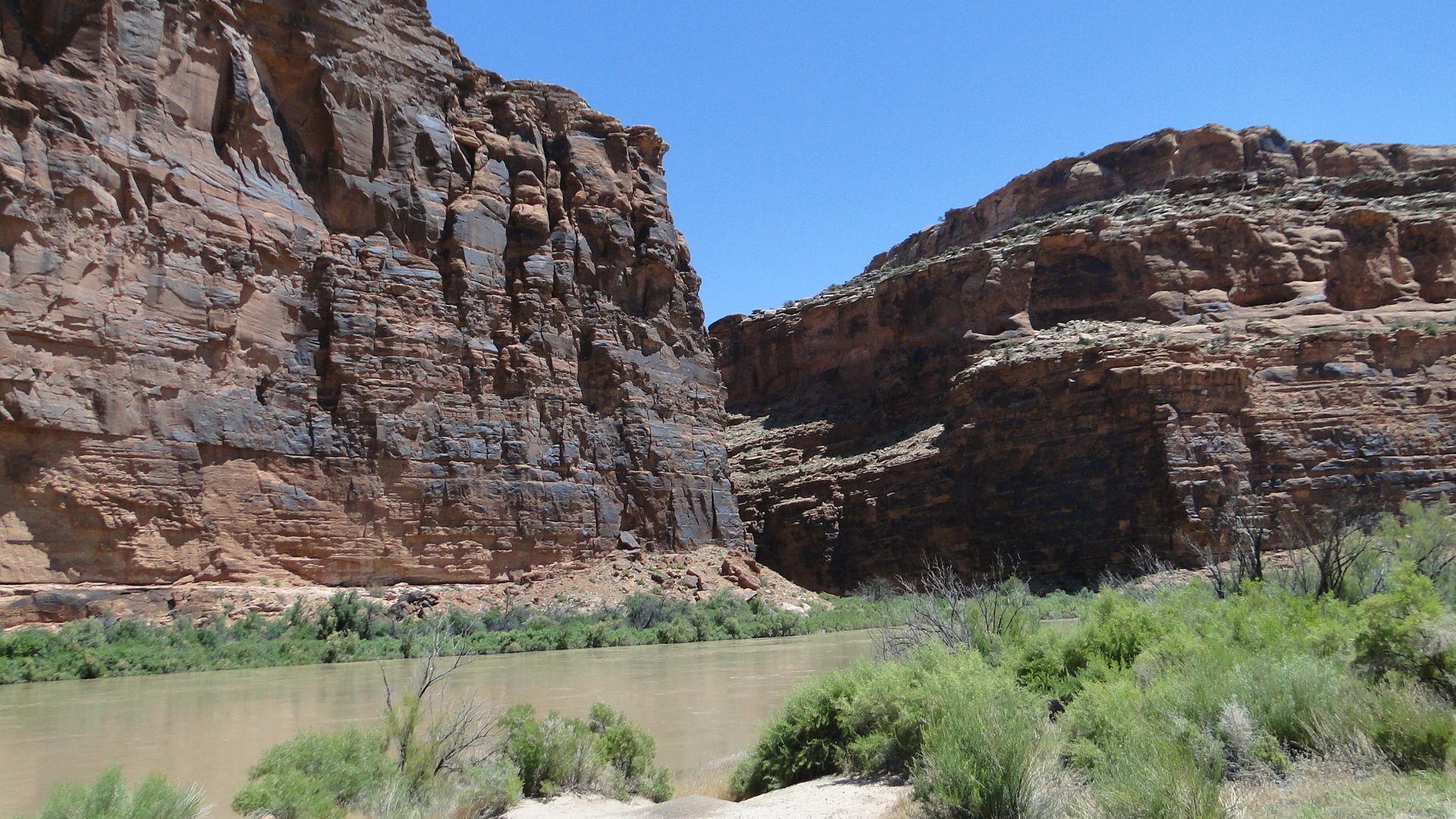 After two days at this magnificent site we headed west to Moab, Utah. The most direct route to Moab is Rt. 70 to Rt.191. However, on advice from some fellow travelers who know the area quite well, we selected a smaller road, Rt. 128 off of Rt. 70 through the abandoned town of Cisco. This proved to be very sage advice as this road (designated as a National Scenic Byway) follows a serpentine path along the Colorado River through a winding narrow canyon with sheer walls of red sandstone. The trip is a bit slower via this route, however the distance between our sites was only a couple of hours, so well worth this alternative path.