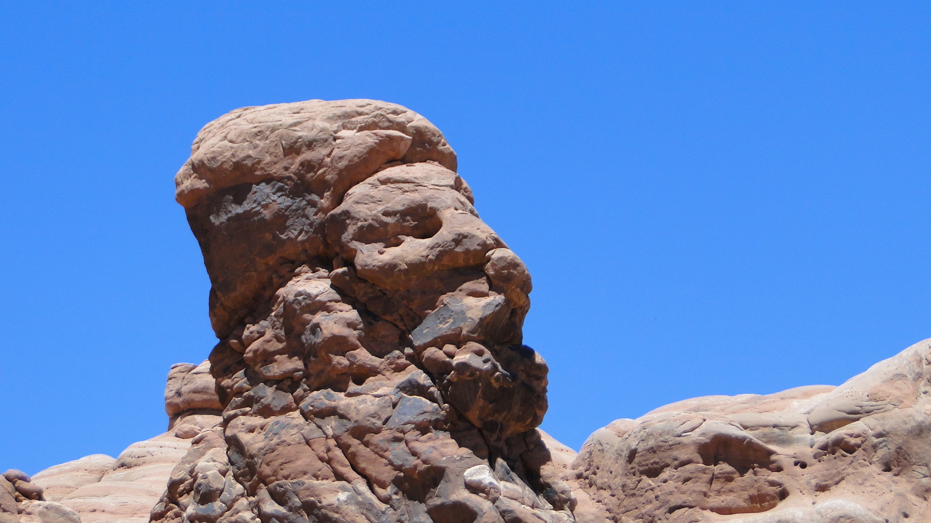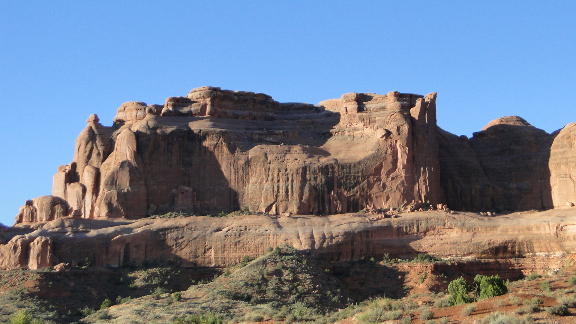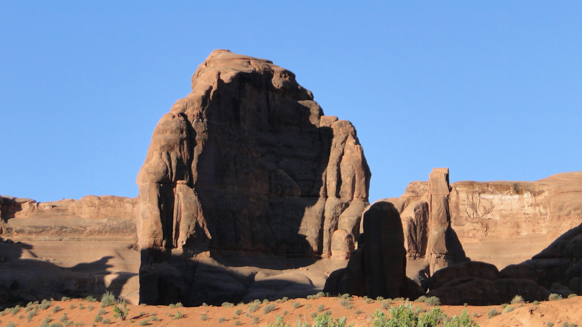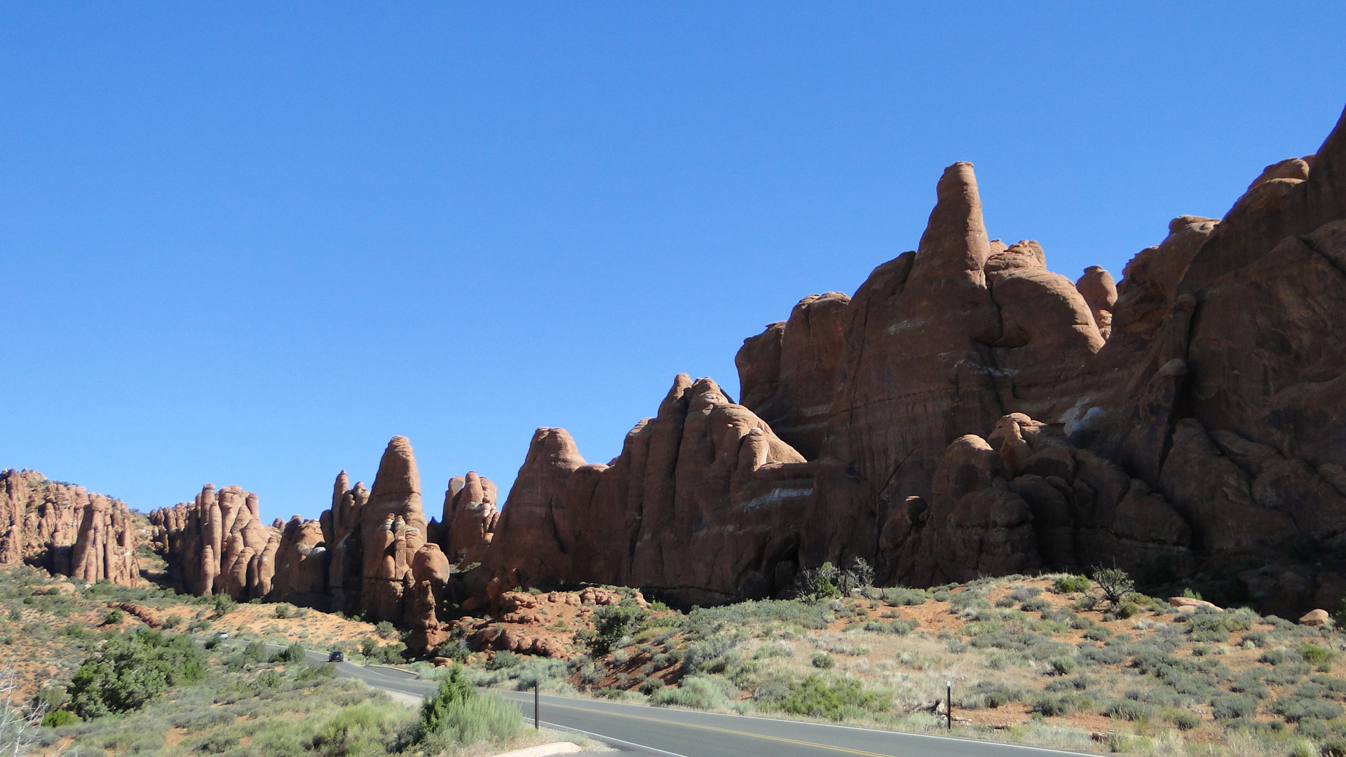 The true gem of this region is Arches National Park. Our research and the literature all suggest that from 9-2 the line to get into the park can be 30 minutes to over an hour, so we arrived by 6:30 a.m. and drove in without delay. By 9:30, many of the observation points and parking areas were crowded with tourists.  This park features the greatest concentration of natural stone arches in the world and includes hiking trails, both short and rather extended, and jaw dropping monoliths, towering spires, pinnacles and balanced rocks. Water, ice, extreme temperatures and underground salt movement are responsible for this sculptured rock scenery. The Puebloan, Fremont and Ute peoples had used this area for thousands of years until the non-native explorers came looking for wealth in mineral form in the late 1800’s. Words cannot adequately describe this scenery so I’ve included many photos to create at least a basic image. As you can see, we had what we skiers call a bluebird perfect day.