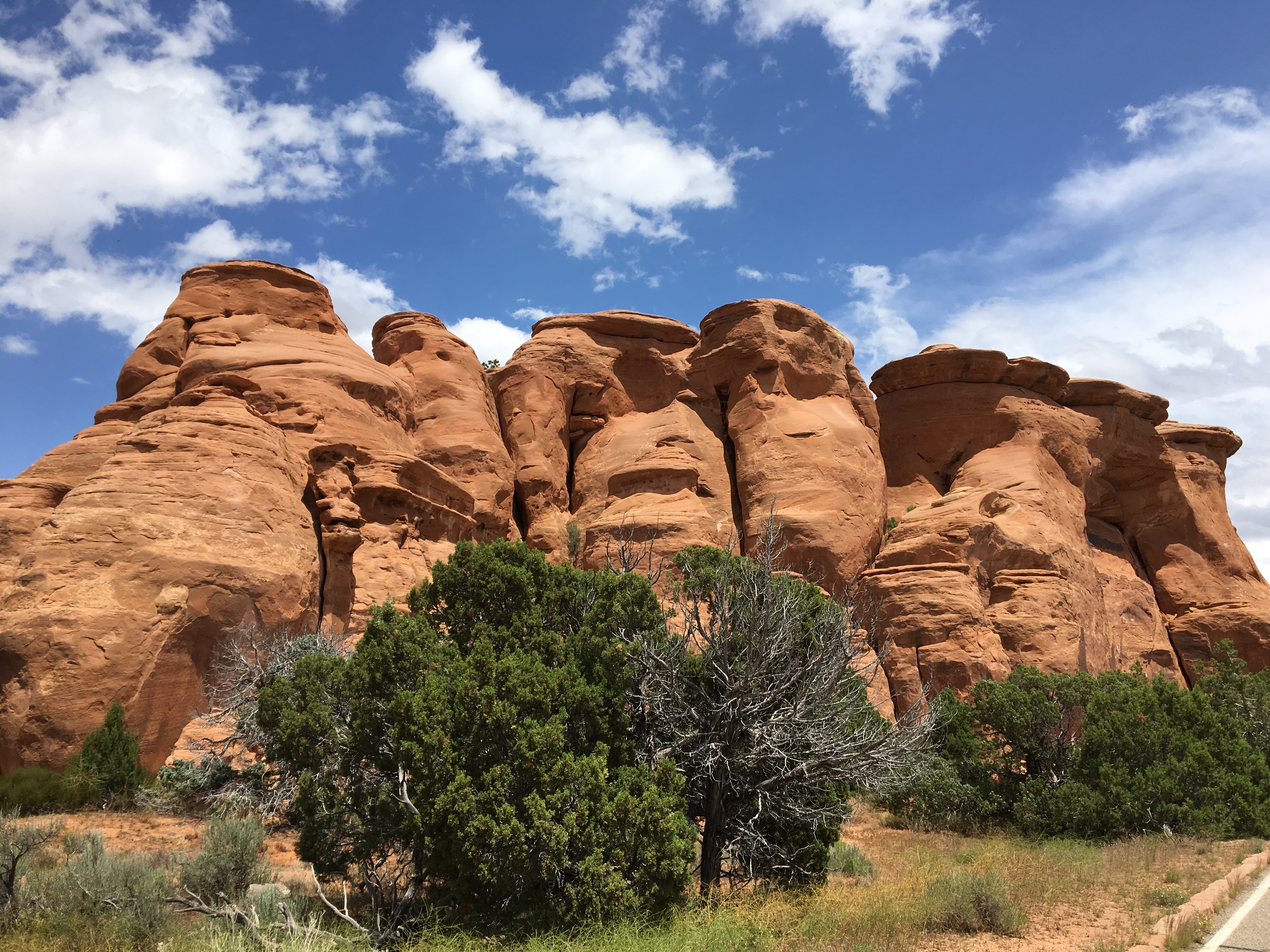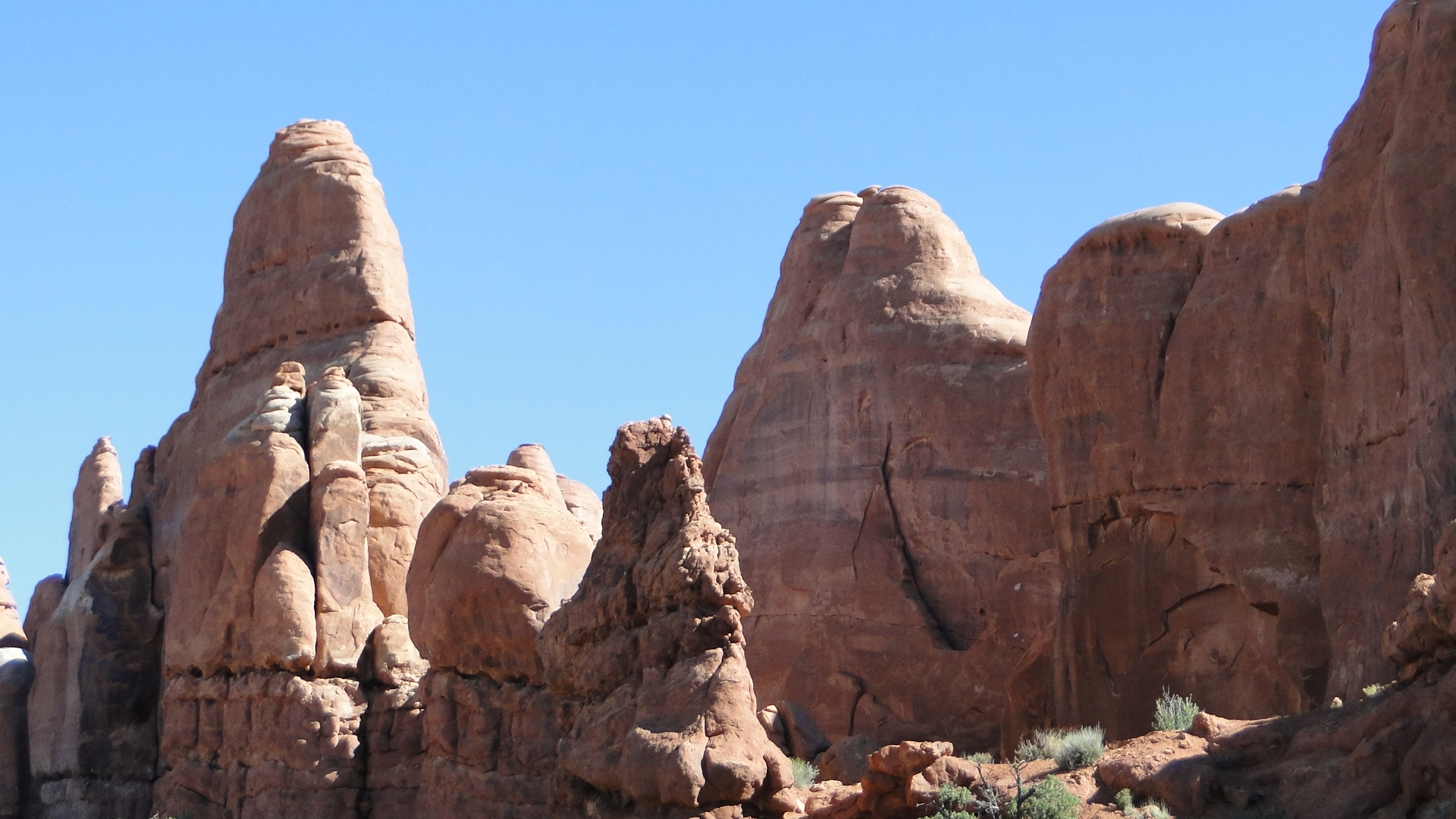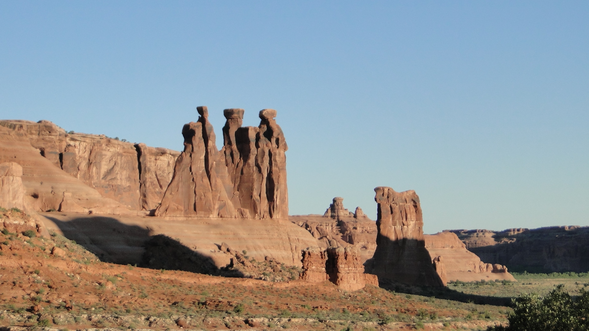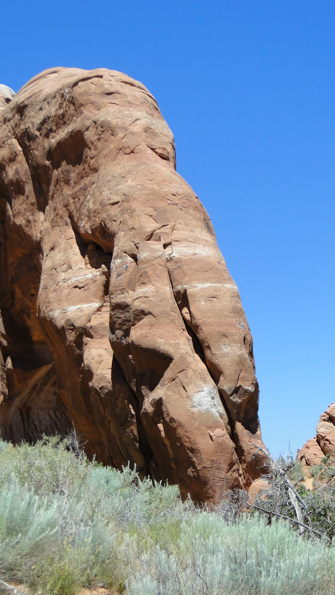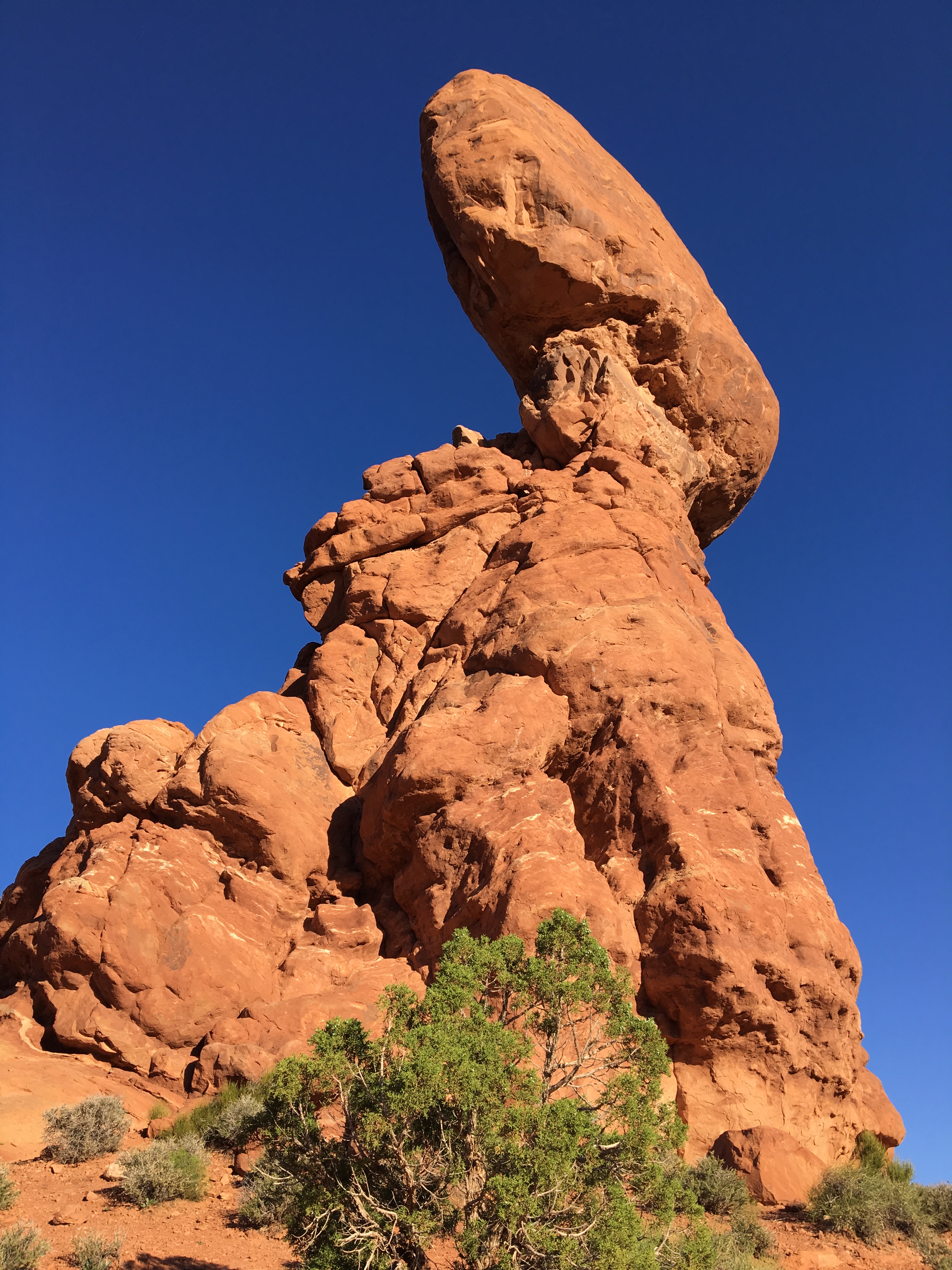 The true gem of this region is Arches National Park. Our research and the literature all suggest that from 9-2 the line to get into the park can be 30 minutes to over an hour, so we arrived by 6:30 a.m. and drove in without delay. By 9:30, many of the observation points and parking areas were crowded with tourists.  This park features the greatest concentration of natural stone arches in the world and includes hiking trails, both short and rather extended, and jaw dropping monoliths, towering spires, pinnacles and balanced rocks. Water, ice, extreme temperatures and underground salt movement are responsible for this sculptured rock scenery. The Puebloan, Fremont and Ute peoples had used this area for thousands of years until the non-native explorers came looking for wealth in mineral form in the late 1800’s. Words cannot adequately describe this scenery so I’ve included many photos to create at least a basic image. As you can see, we had what we skiers call a bluebird perfect day.