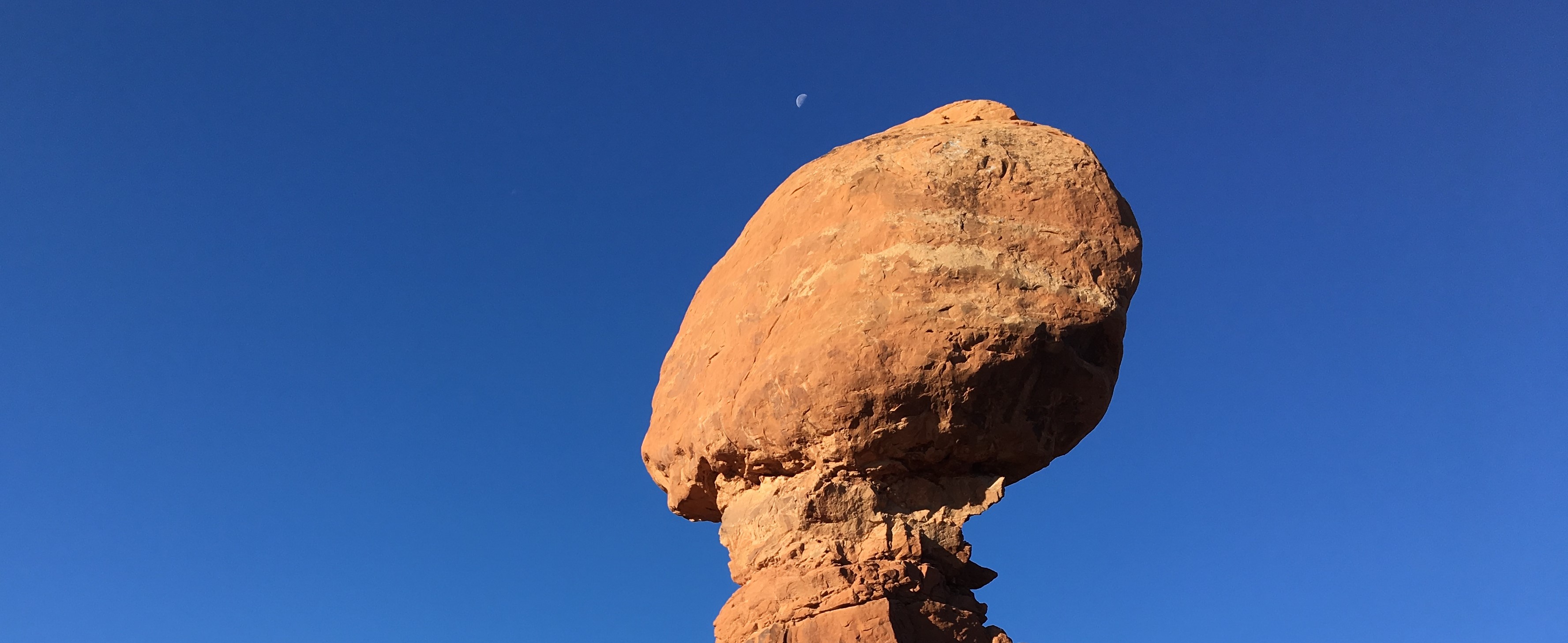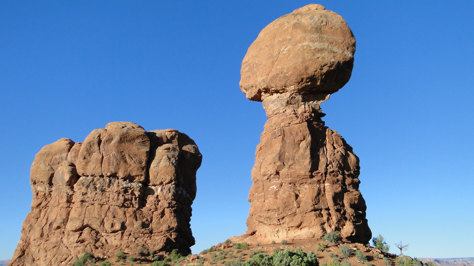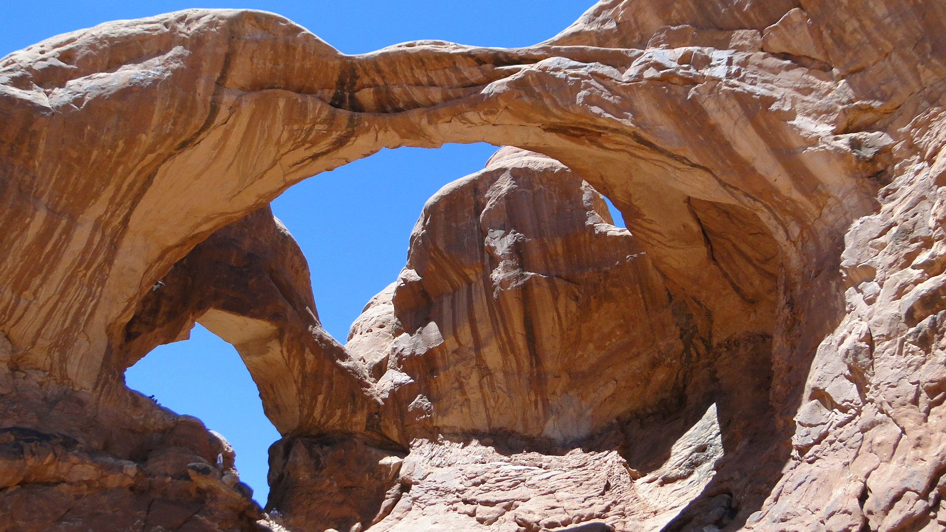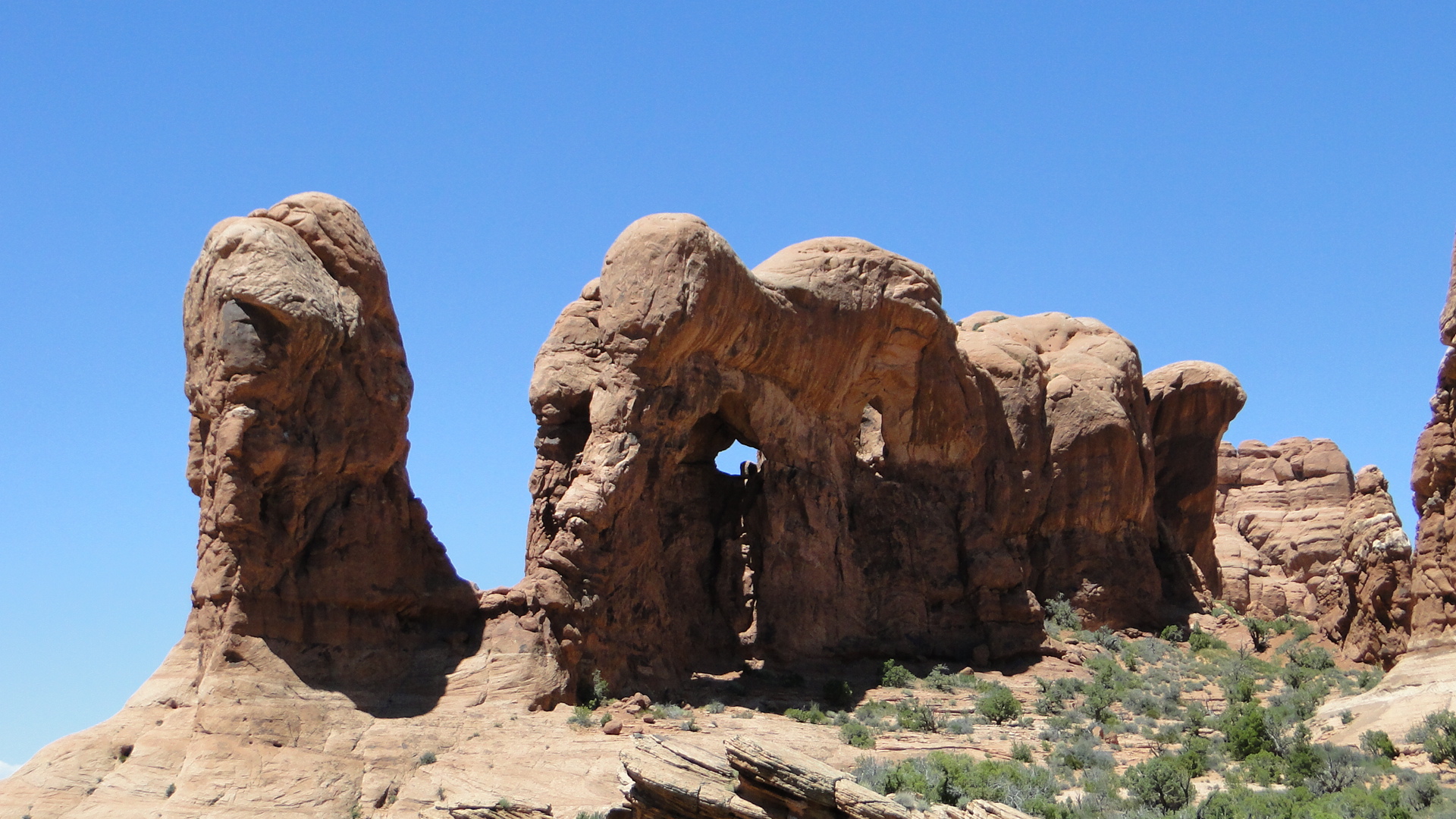 The true gem of this region is Arches National Park. Our research and the literature all suggest that from 9-2 the line to get into the park can be 30 minutes to over an hour, so we arrived by 6:30 a.m. and drove in without delay. By 9:30, many of the observation points and parking areas were crowded with tourists.  This park features the greatest concentration of natural stone arches in the world and includes hiking trails, both short and rather extended, and jaw dropping monoliths, towering spires, pinnacles and balanced rocks. Water, ice, extreme temperatures and underground salt movement are responsible for this sculptured rock scenery. The Puebloan, Fremont and Ute peoples had used this area for thousands of years until the non-native explorers came looking for wealth in mineral form in the late 1800’s. Words cannot adequately describe this scenery so I’ve included many photos to create at least a basic image. As you can see, we had what we skiers call a bluebird perfect day.