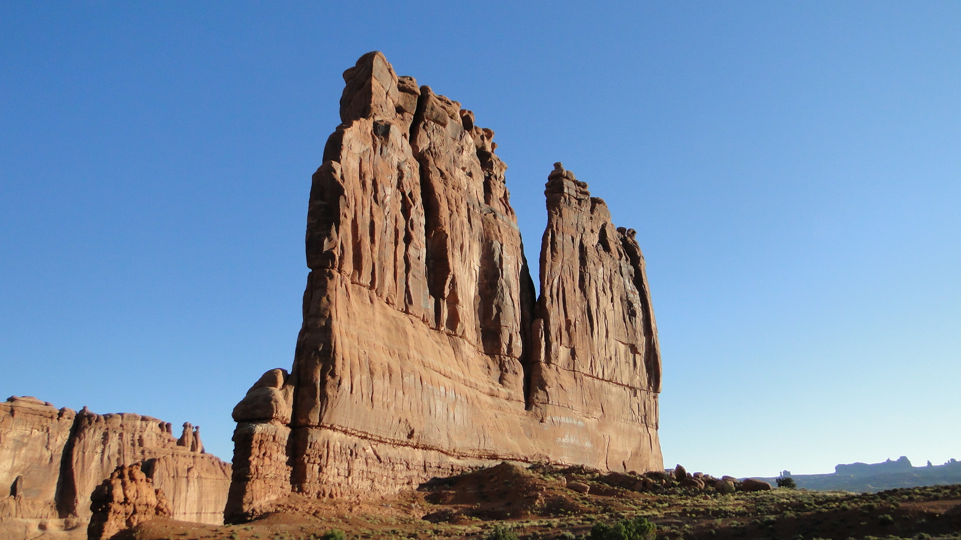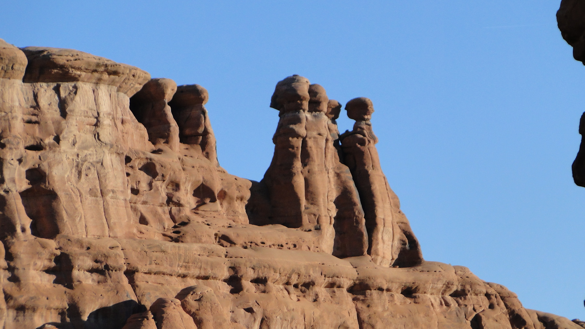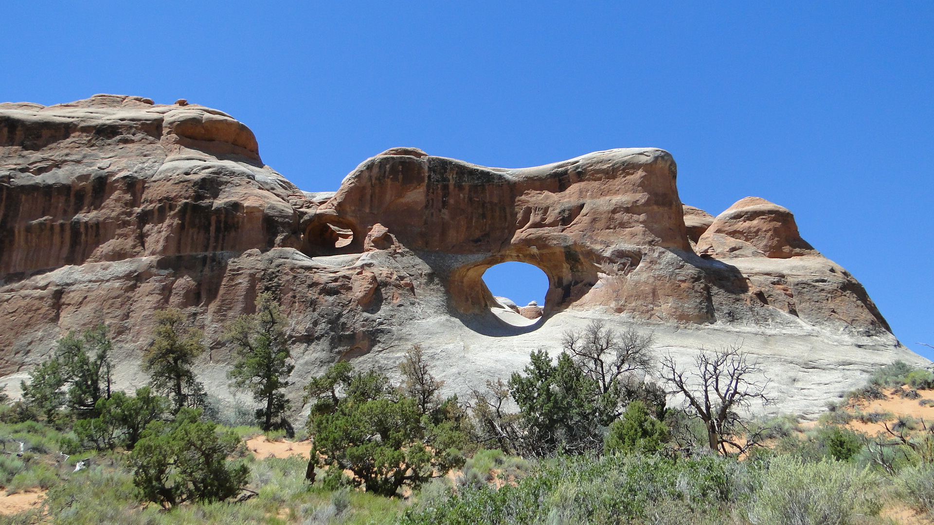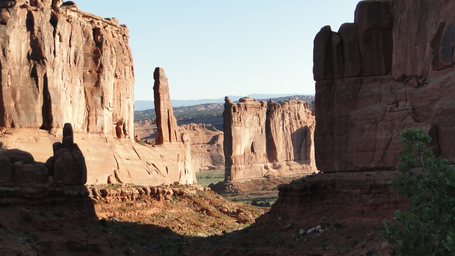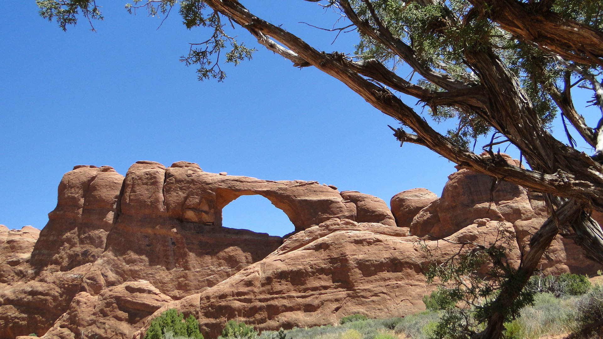 The true gem of this region is Arches National Park. Our research and the literature all suggest that from 9-2 the line to get into the park can be 30 minutes to over an hour, so we arrived by 6:30 a.m. and drove in without delay. By 9:30, many of the observation points and parking areas were crowded with tourists.  This park features the greatest concentration of natural stone arches in the world and includes hiking trails, both short and rather extended, and jaw dropping monoliths, towering spires, pinnacles and balanced rocks. Water, ice, extreme temperatures and underground salt movement are responsible for this sculptured rock scenery. The Puebloan, Fremont and Ute peoples had used this area for thousands of years until the non-native explorers came looking for wealth in mineral form in the late 1800’s. Words cannot adequately describe this scenery so I’ve included many photos to create at least a basic image. As you can see, we had what we skiers call a bluebird perfect day.