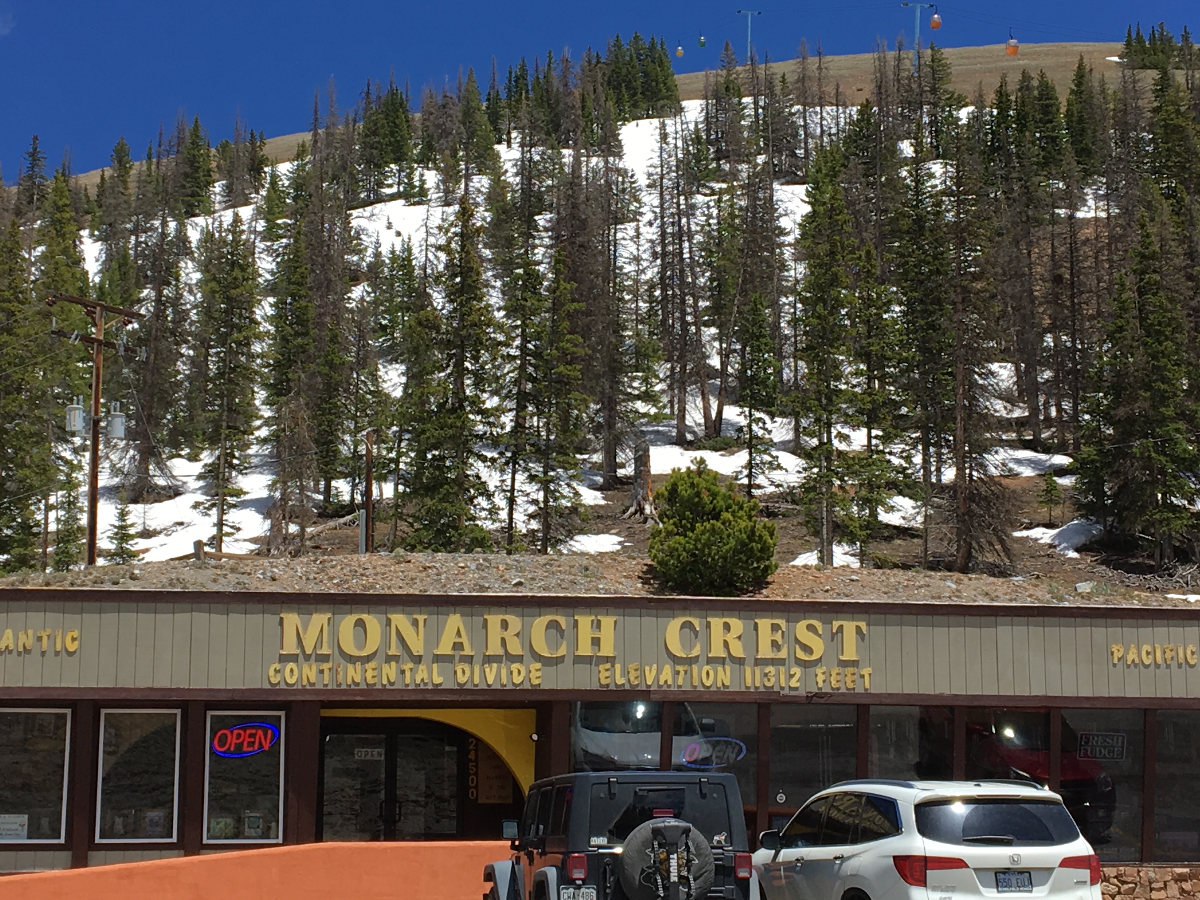 This developing vista first takes us over the Poncha Pass, a hefty 9010’ before we slowly climb the Monarch Pass at 11,312’ above sea level. The Monarch Pass is the continental divide, the hydrological divide of North America. The road climbs for miles as you approach the peak. At the summit where snow is still in abundance, is of course, a gift shop, a welcome relief to fatigued vehicles and drivers, for this climb is a nerve -racking business. It is slow, winding, and requires your full attention.  At the summit is also Monarch Mountain ski resort and a gondola to carry summer visitors to the mountain summit.