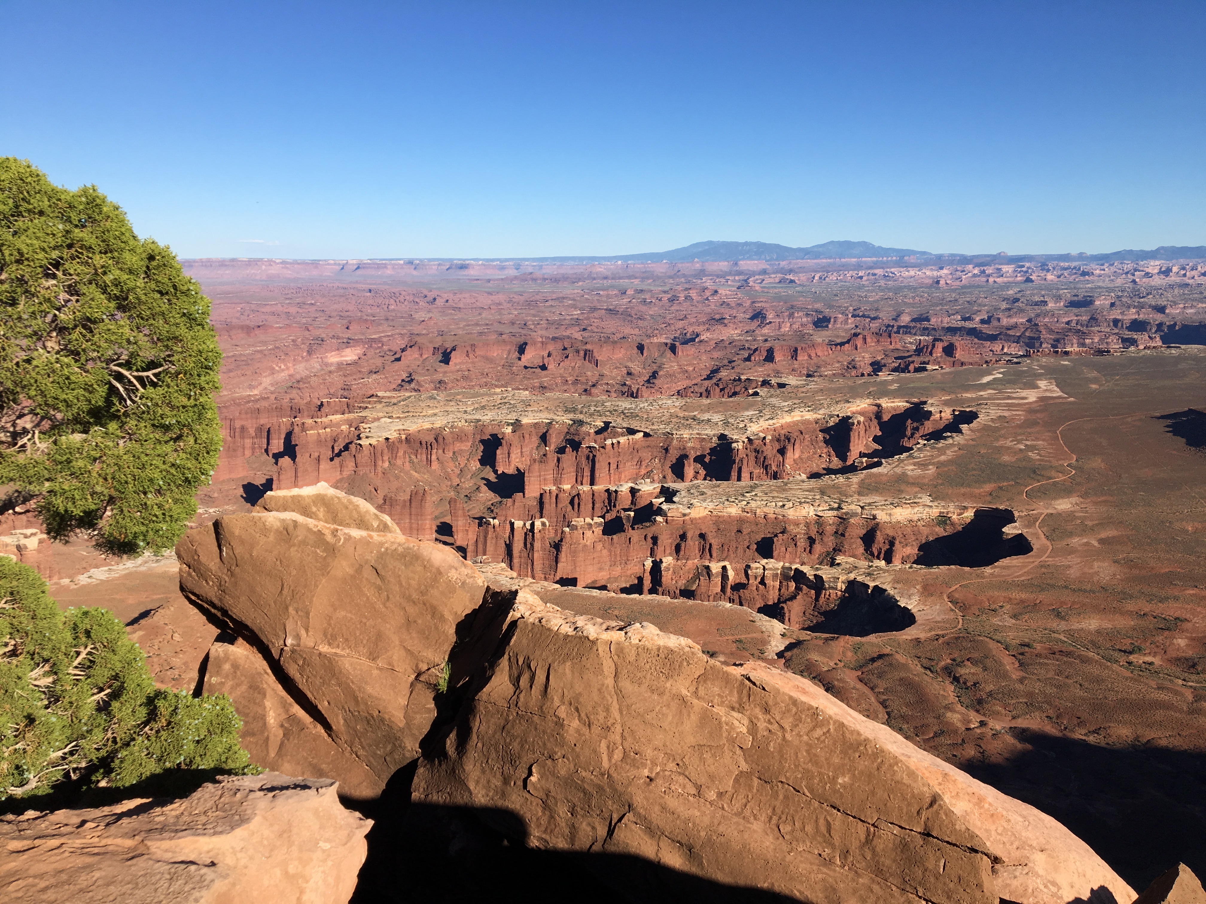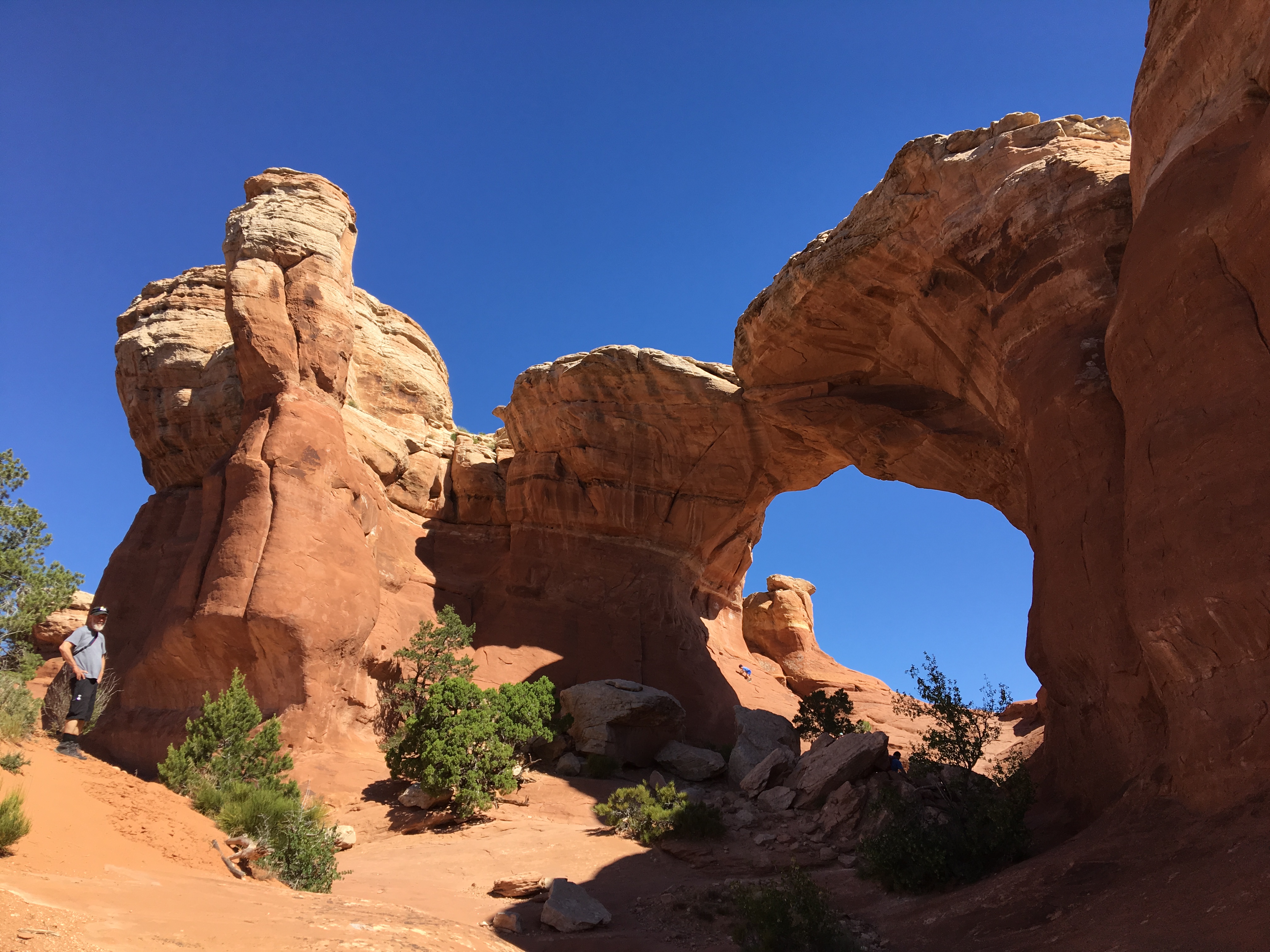 Our next stop was a small private campground that sits along the Pack Creek, 3 miles south of the town of Moab, Utah. Pack Creek Campground was a marvelous little find that had full hook-ups (FHU), very clean bathrooms, with showers, laundry room and is very close to Moab and Arches National Park, the reason we have come here. Arches is an enormous tourist draw and the parking areas at all of the trailheads and overlooks are rather small. We decided to rent a car for this area as our RV might be problematic at these parking areas. In Moab, there is only Enterprise Car Rental, with two locations, but only one agent based in town allegedly from 8-5, but out at the airport everyday from 4:30-6. (We never did reconcile the conflicting hours) There is one flight per day from Denver that they service so if you decide to rent a car you need to coordinate the timing with the agent. Since the airport is 24 miles north of town, we parked the RV at the camp site and called an Uber to take us to the airport. (Not sure, but Josh may be the only Uber/Lyft driver in town as we used him twice. Nice guy who shared regional information) This proved to be a valuable time saver as we were able to tour another National Park on our way south from the airport on Day 1 in Moab. The Canyonlands Park showcases the canyons of the Green and Colorado Rivers from an easily accessible paved road. There is a primitive campground there and the views are wide and expansive. Because the road is so high above the canyon floor, the views will vary with the angle of the sun and time of day. (This you will notice with all canyon viewing – angle of the sun changes the colors that you observe on the canyon walls) Canyonlands is accessible from the north, where we entered, and also from 3 hours south of Moab at Needles. Though this was a very interesting and beautiful park, I would not recommend going to Moab just to visit this park.