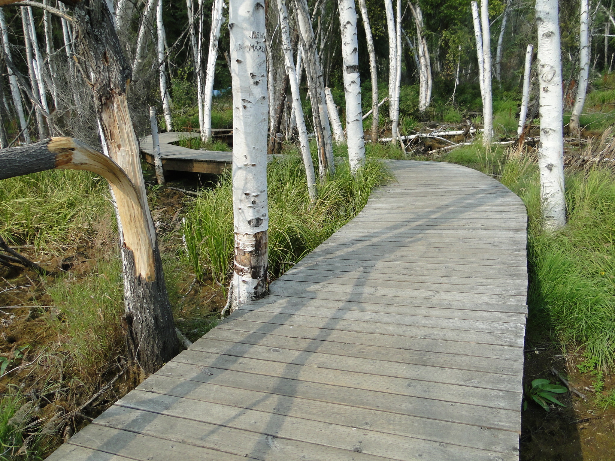 Camping that night at the Williwaw National Park Campground on the Portage Road was an exceptional find. This primitive campground is surrounded by steep jagged mountains topped with glaciers and is adjacent to a glacial stream runoff from the Portage Glacier. The sites are beautifully designed for very nice privacy, have pit toilets and beautiful walking trails that include a wooden boardwalk over a marsh complete with two suspension bridges. The trail system is called “The Blue Ice Trail”. While there we visited the Portage Glacier and did a bit of comparison with how we saw this glacier 8 years prior.