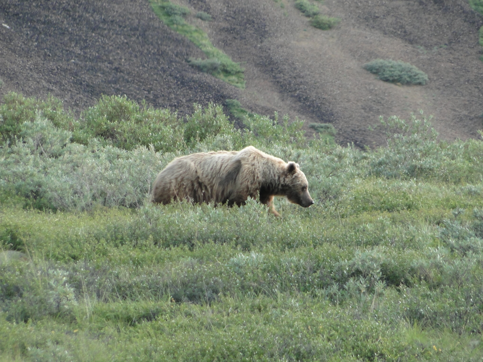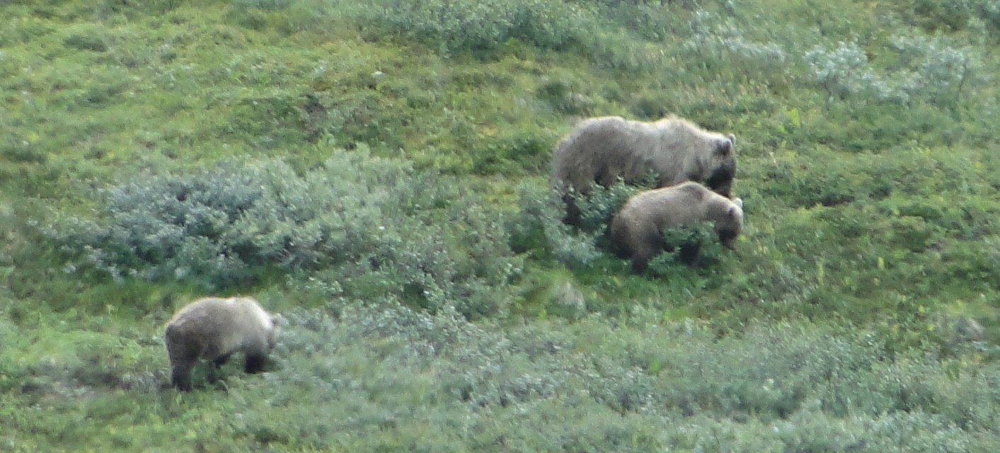 Denali is a massive park system with several primitive campgrounds that you can drive into, several tent only campgrounds that you ride a shuttle bus to, and some luxury resorts that you travel to via bus or van. One can only drive a vehicle into the first 20 miles of the park. Thereafter you are required to ride the transit buses or the tour buses as the road is extremely narrow, with steep cliffs at every turn, dirt and gravel only and an abundance of wildlife. (The transit bus drivers are not required to narrate but many do, whereas the tour bus drivers give a full narration – at a premium cost) You purchase passage on the bus based on how far and how many hours that you want to travel. The road is 92 miles one way to the end at Kantishna so taking the bus to the end and back (one of the bus options) is a 12 hour excursion. There are regular bathroom stops as well as several longer photo opportunities and a visitor center at mile 66.(45 minute break) Though there are several options for buses, all stop when wildlife is spotted. The passengers are instructed to call out “Stop” when they spot something or, if possible, what you see and what direction- “bear at 3 o’clock.” The drivers stop as quickly as possible, often times turning the bus for better viewing and even back up if they’ve missed it.