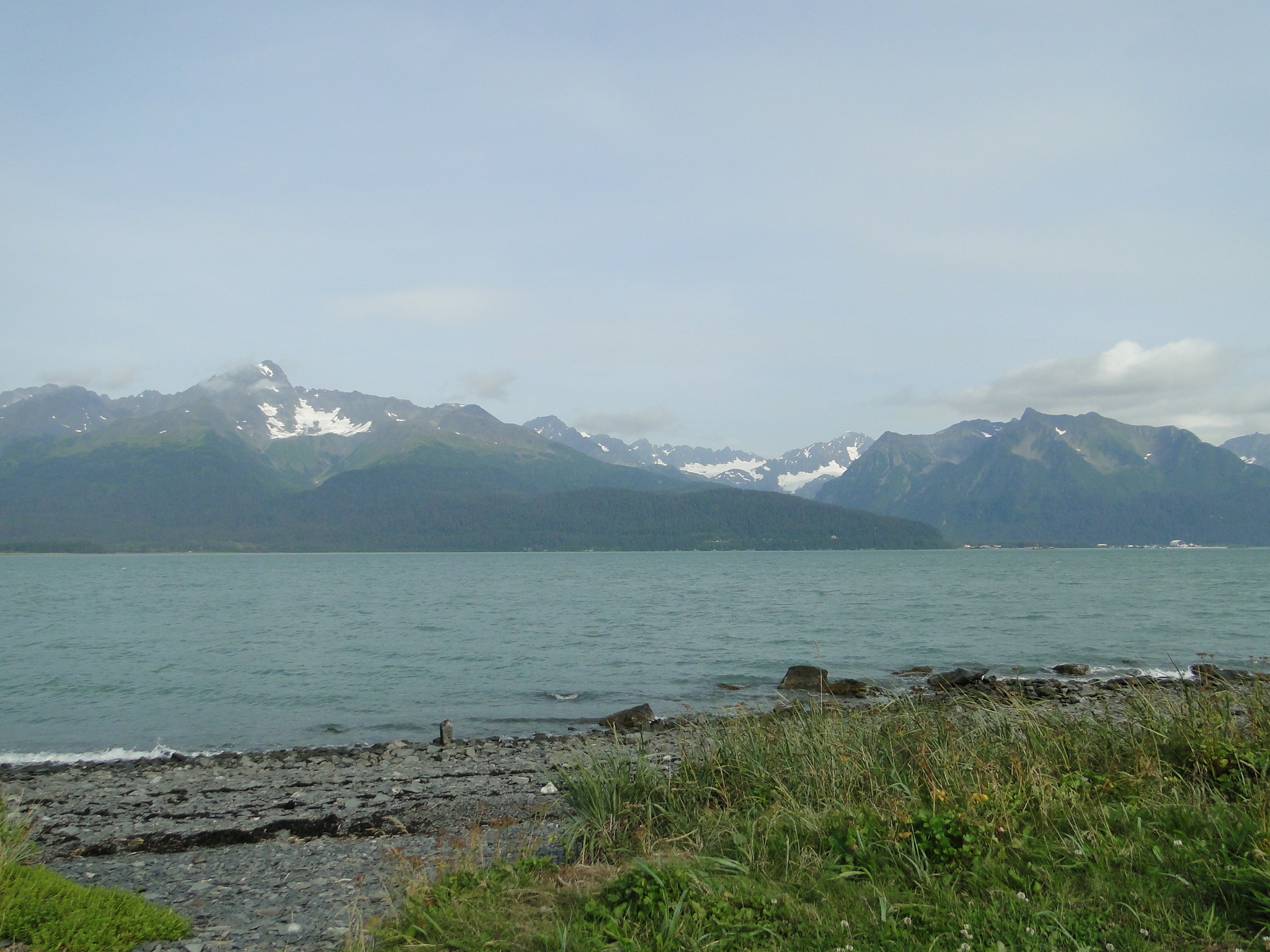 After a beautiful evening at this magnificent campsite, we headed south on the Seward Highway to the public campground at the Seward Harbor on Resurrection Bay. This is a very crowded parking lot campground but situated on the Bay more than covers any claustrophobia. The trick here is to get a water-front site and that demands an early arrival as all sites are first come, first served. There are several harbor campgrounds, all contiguous, and offer various levels of amenities. We were fortunate to get a water-front site with no hook-ups, $20/night. The photos from our campsite below barely capture the emotion of sitting on this body of water.