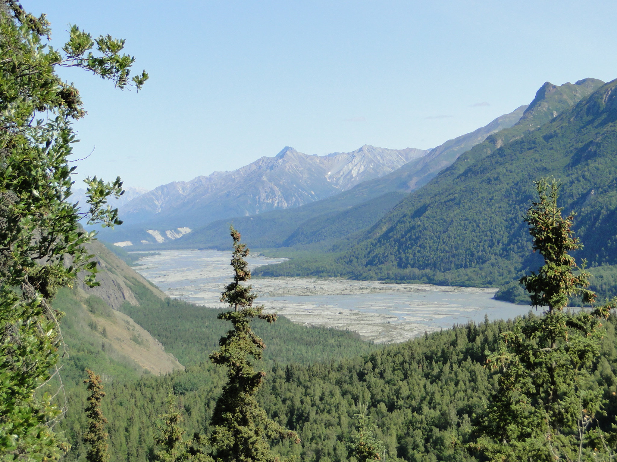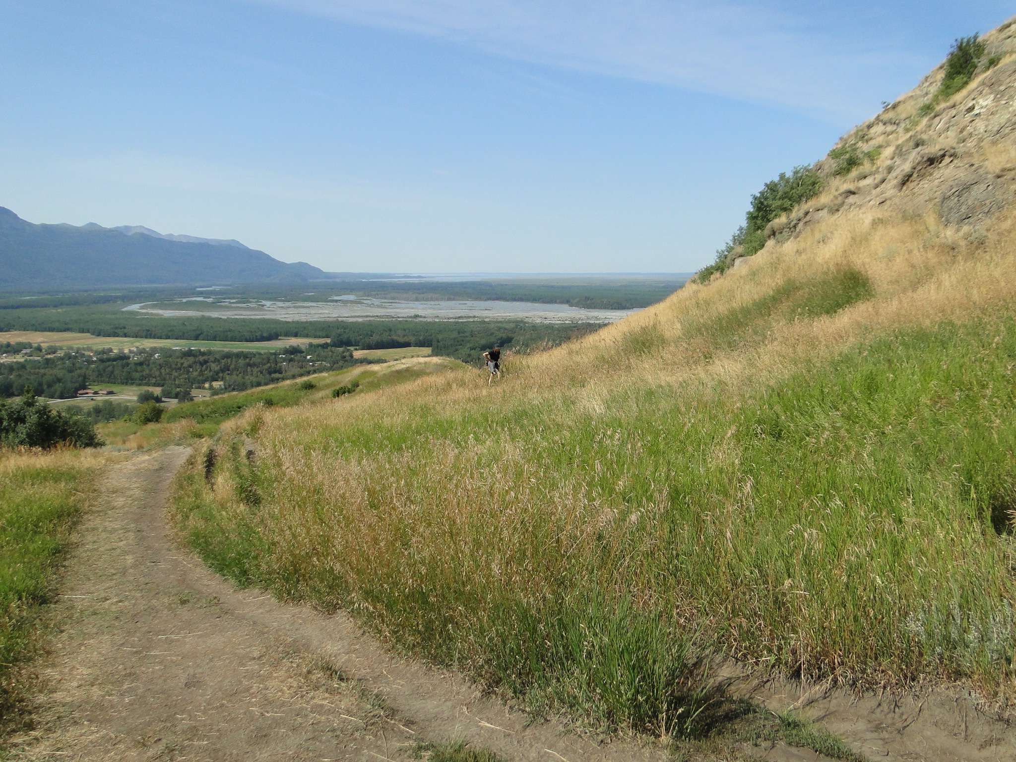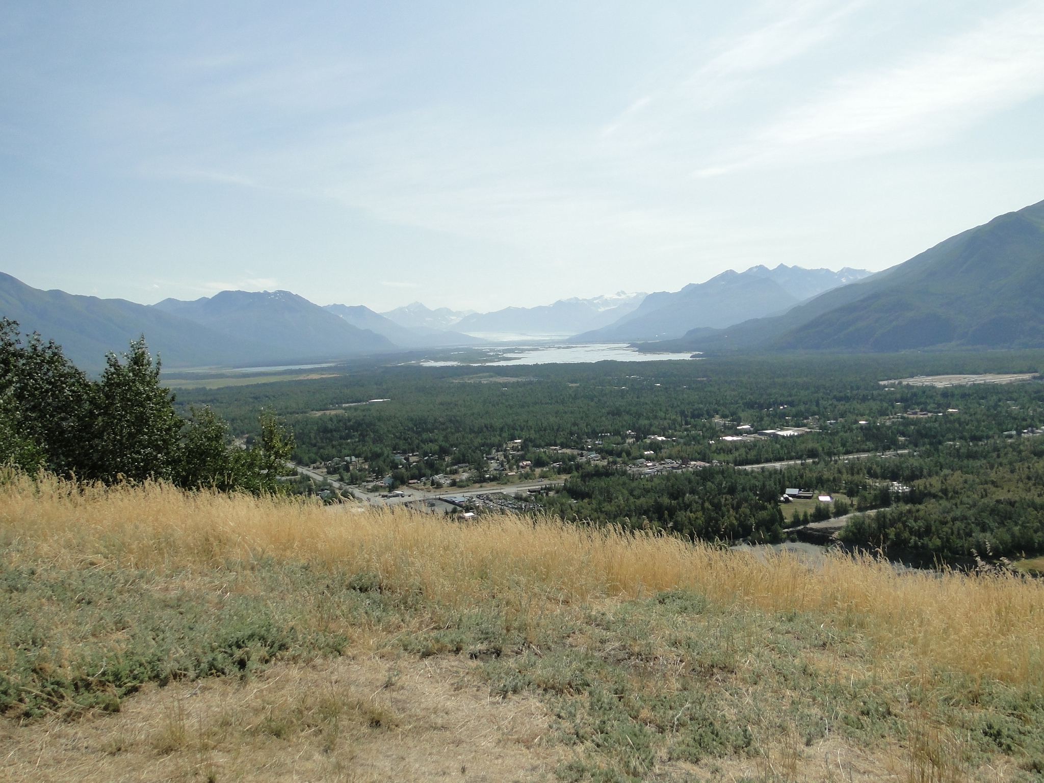 We spent just one night in Anchorage visiting with some family friends and then headed east towards the Glenn Highway, one of the major reasons we returned to Alaska. First stop was to hike The Bodenburg Butte, a one mile loop trail in Palmer, just 35 miles northeast of Anchorage. This trail offers exceptional views of the Knik River valley. The trail, though relatively short, is incredibly steep from the eastern entrance and quite demanding. We did not realize that there was a western approach that was not quite as strenuous but fortunately met three delightful women who offered us a ride from the western parking lot, so needless to say, we hiked out in that direction.