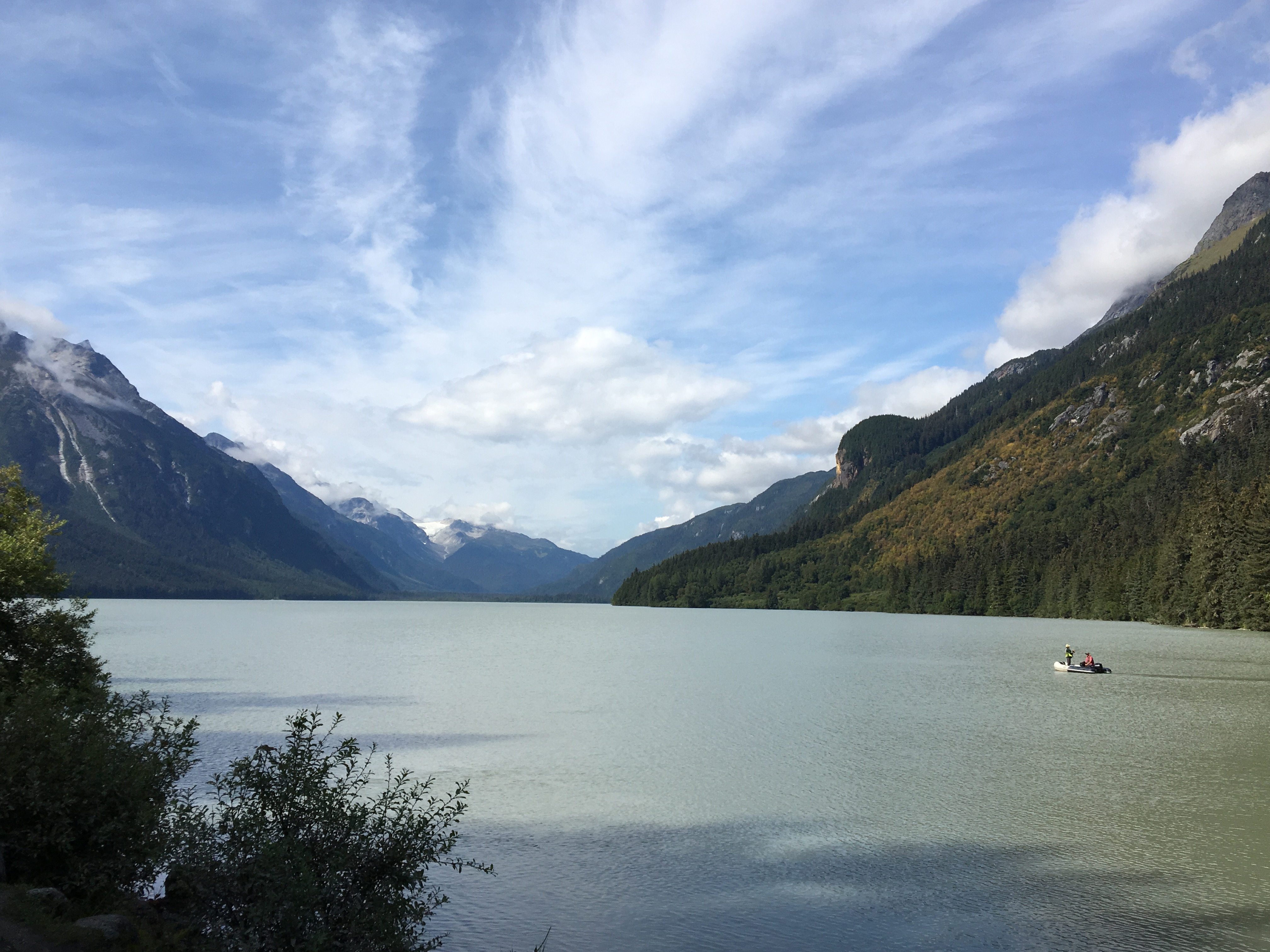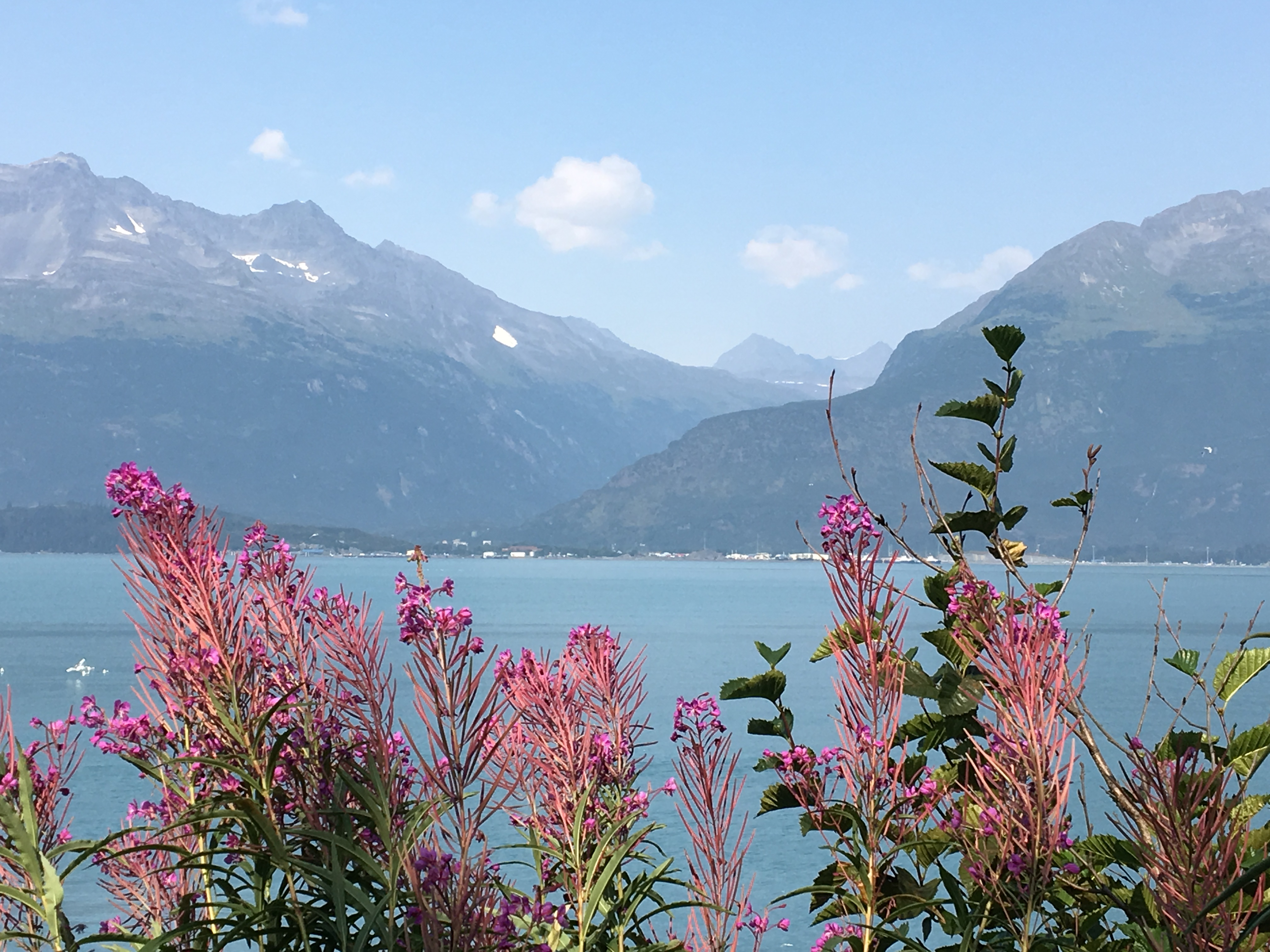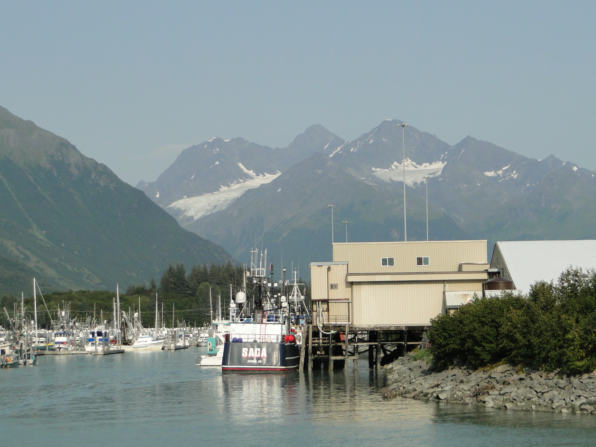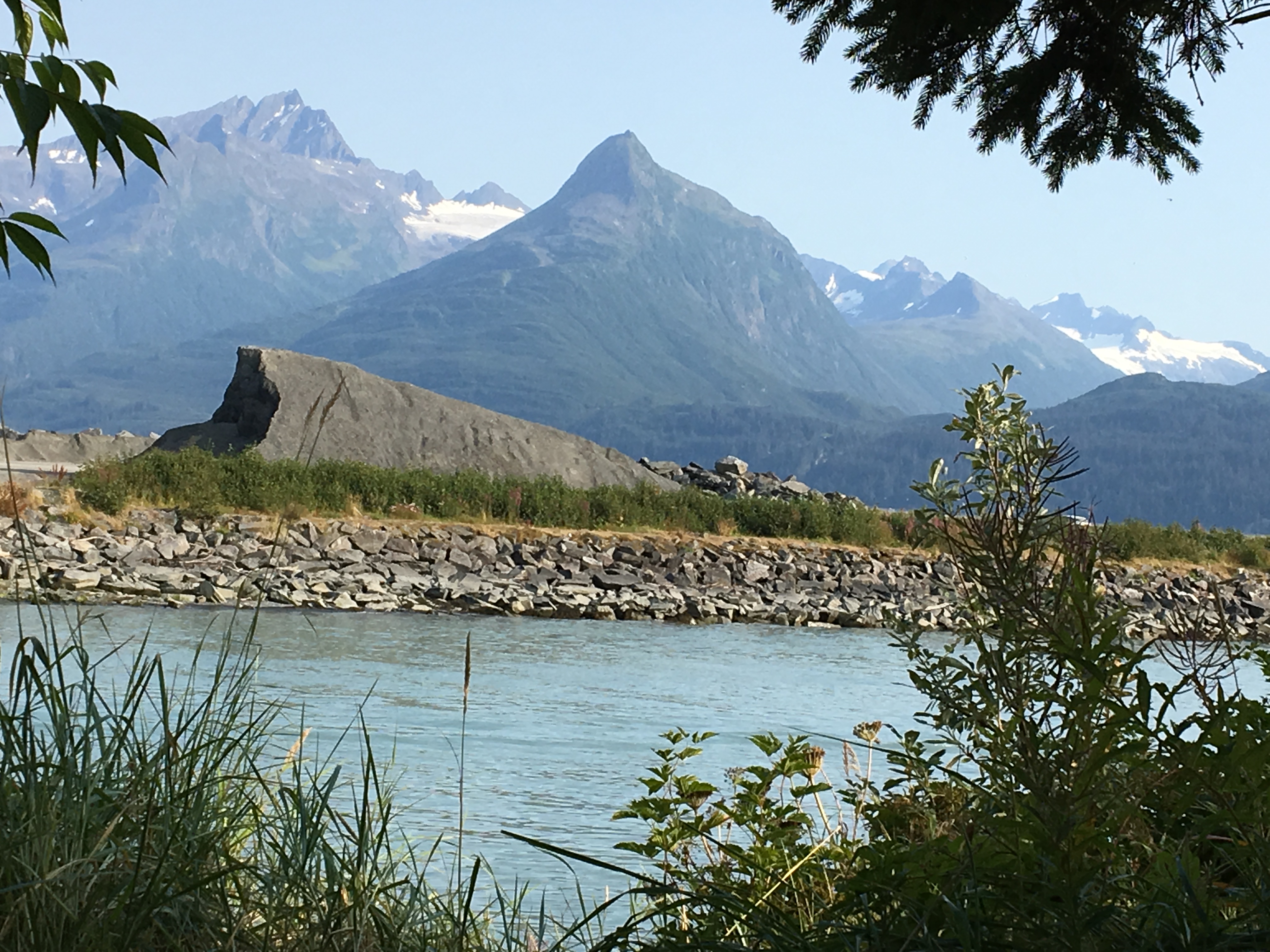 The highway finally reaches sea level as we enter Valdez (Pronounced Val-Deez) and begin to see the developing landscape. The town is situated on the Valdez Arm, a protected bay on the Prince William Sound, and is surrounded by towering mountains capped with snow and glaciers. We are camped at the Bear Paw Adult Campground (rather than their family area) on the channel for the small boat harbor. Due to the amazing fishing in this area, there is always some type of fishing derby occurring and while we were there was the Women’s Silver Salmon Derby. All of the fishing charter boats had been reserved over a year in advance for this competition, taken very seriously by the locals. The area offers an enormous array of activities from glacier tours to white water rafting, sailing and fishing charters.