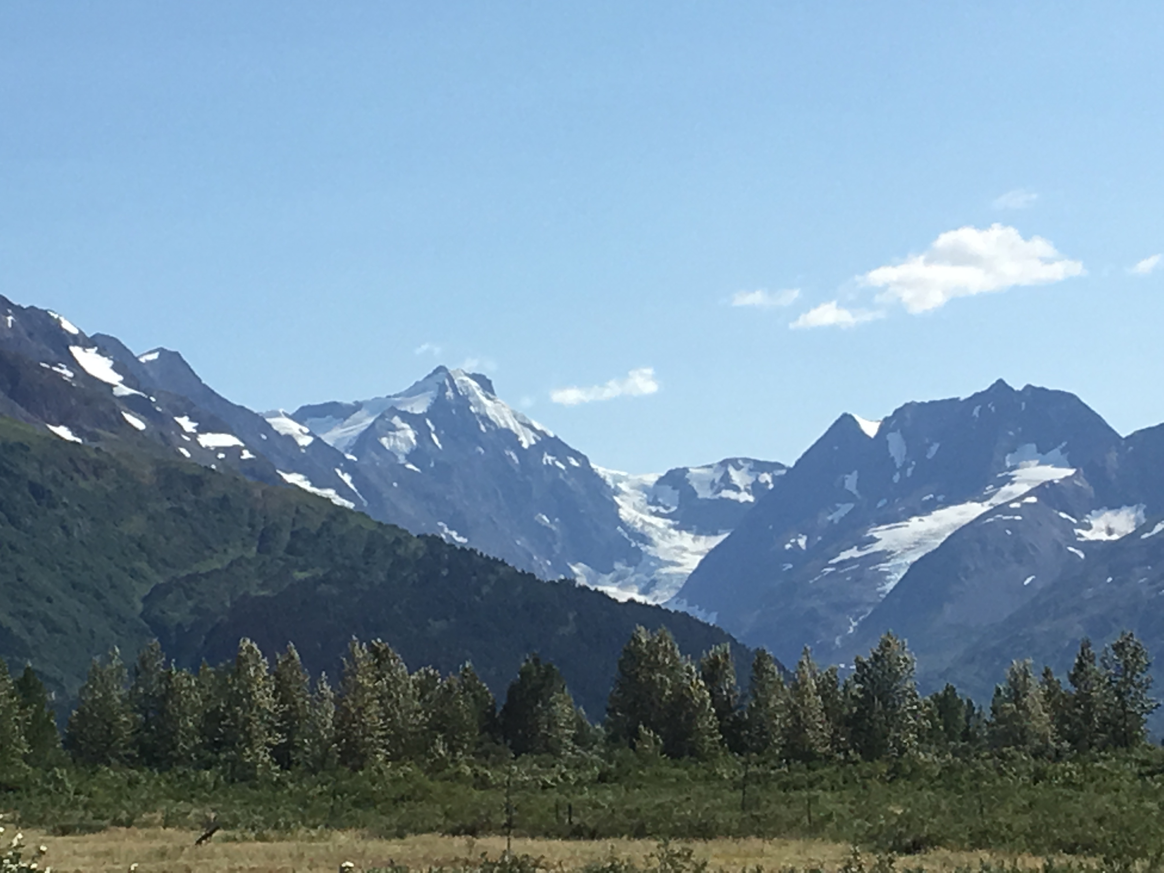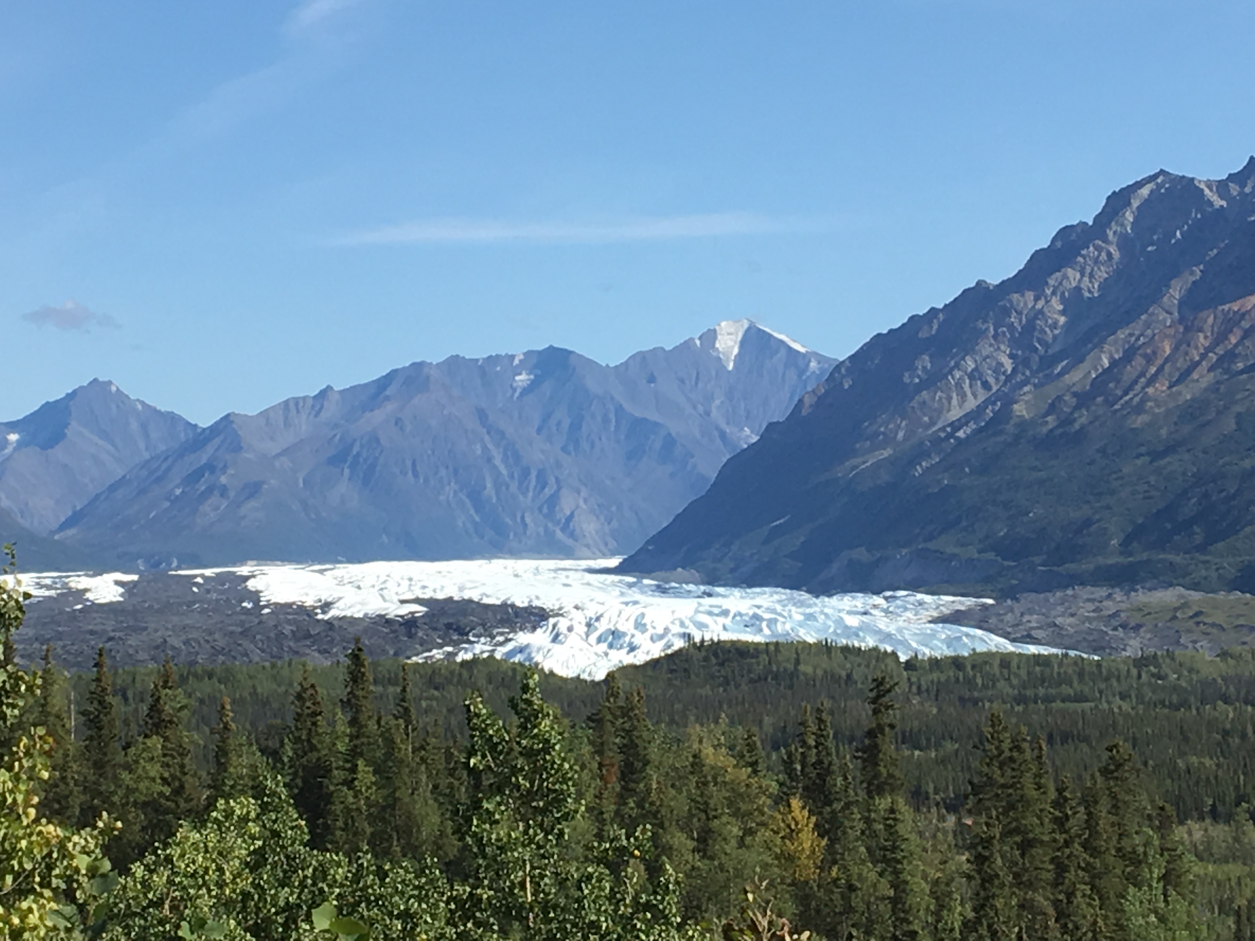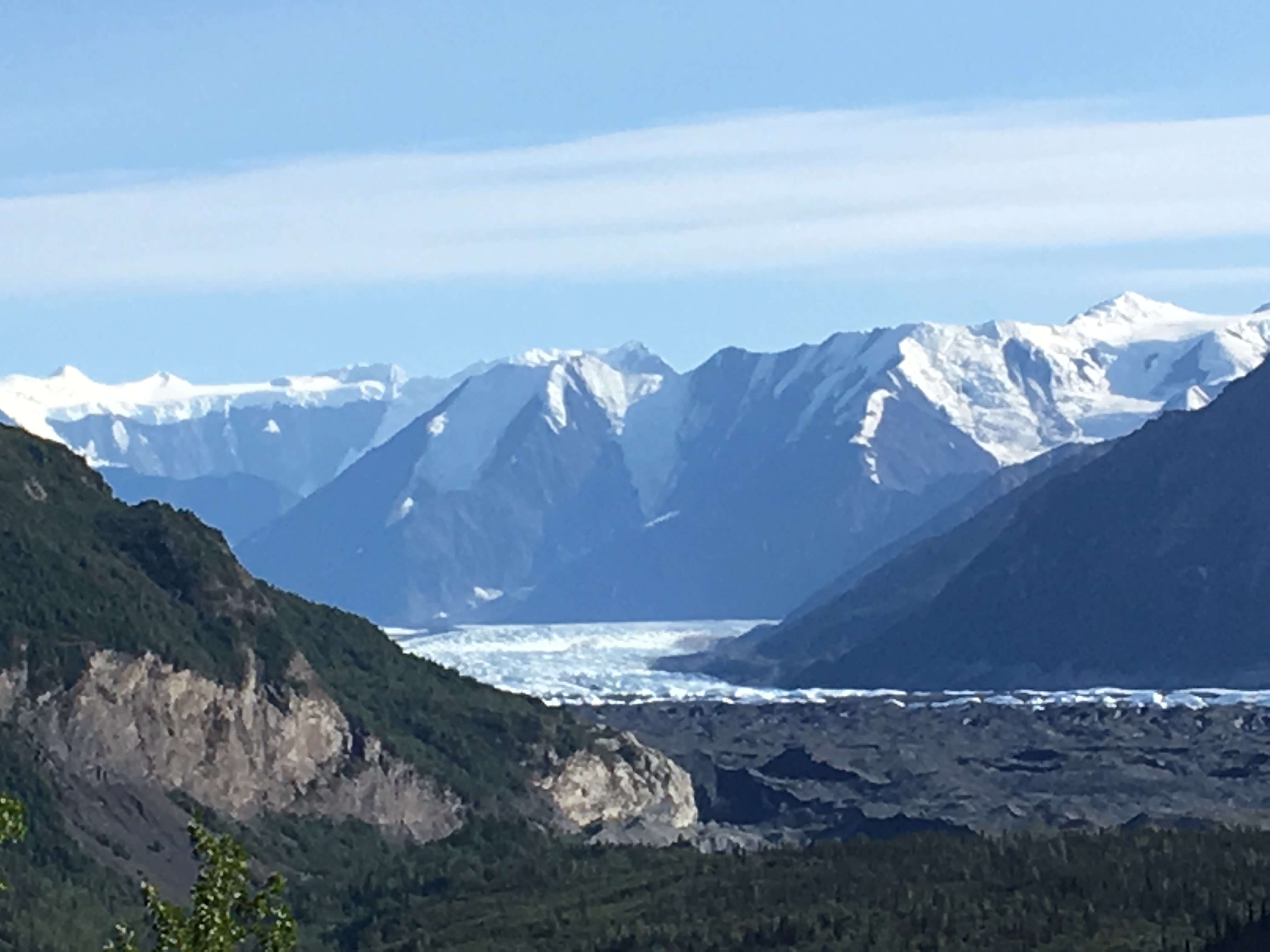 The Glenn Highway was as magnificent as we envisioned 8 years ago when we barely caught a glimpse. The road winds through the southern end of the Mat-Su Valley of steep pointed mountains and eventually leads to the Matanuska Glacier, the largest glacier in Alaska that can be reached by road. It is 26 miles long and 4 miles wide at its terminus. The glacier can be accessed via the privately owned Matanuska Glacier Park for a $20 fee, but can be seen from a close distance on the road.