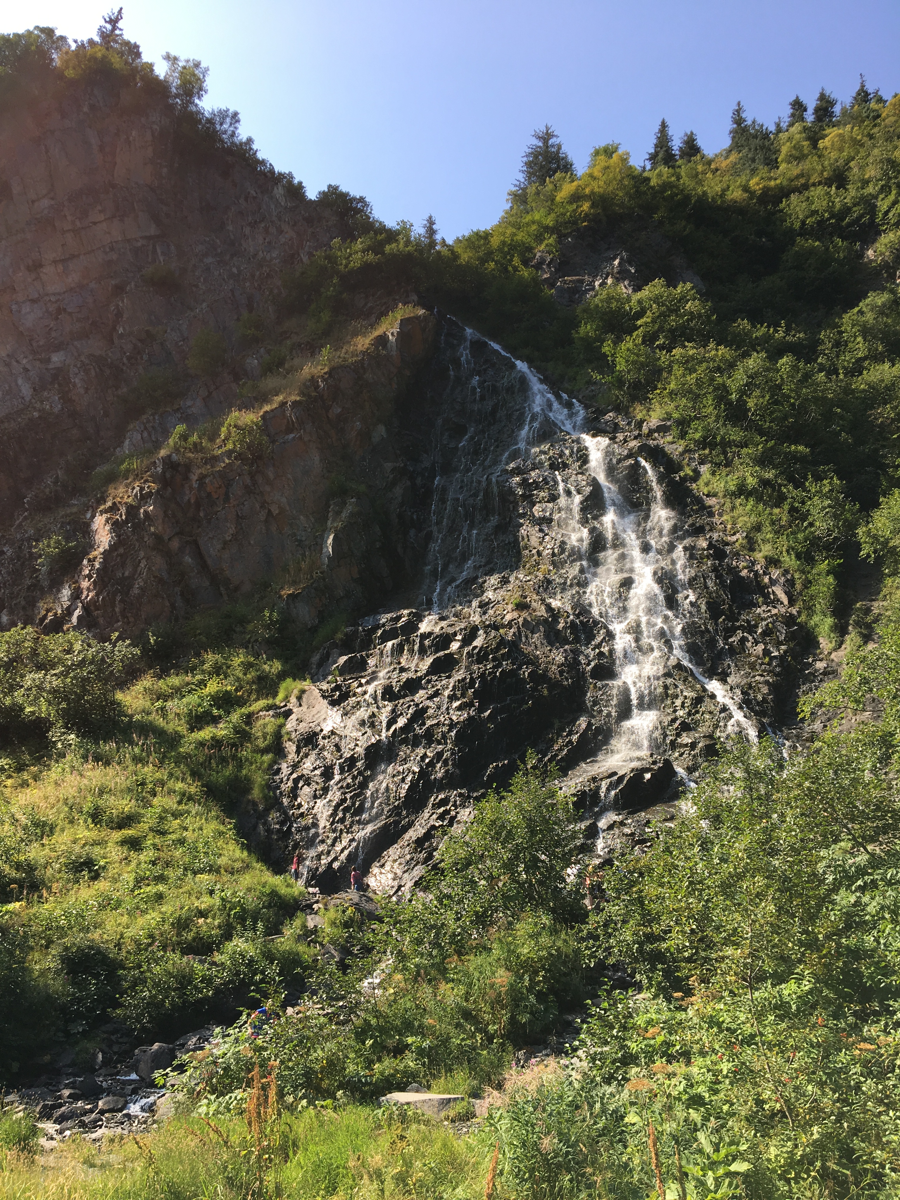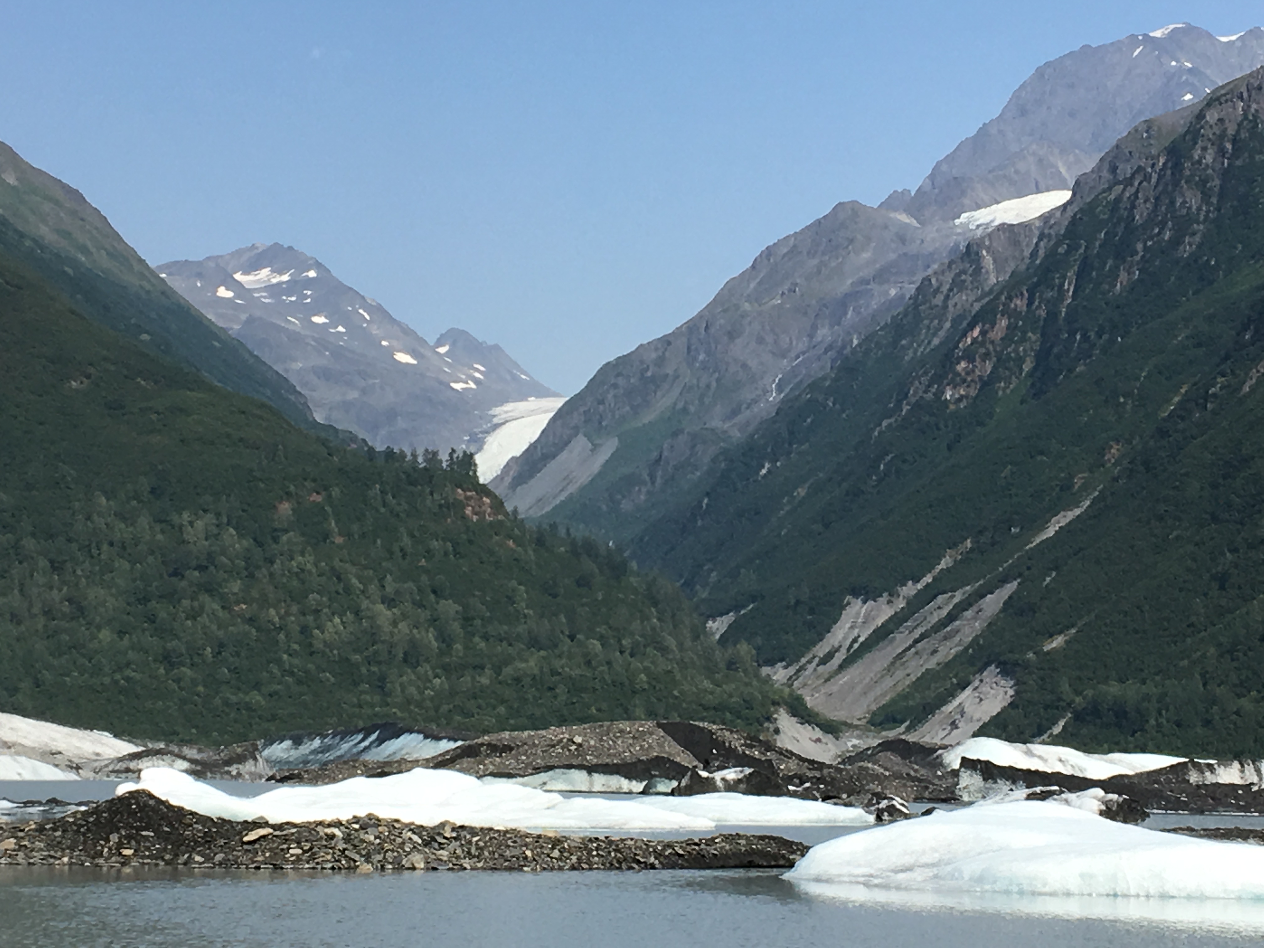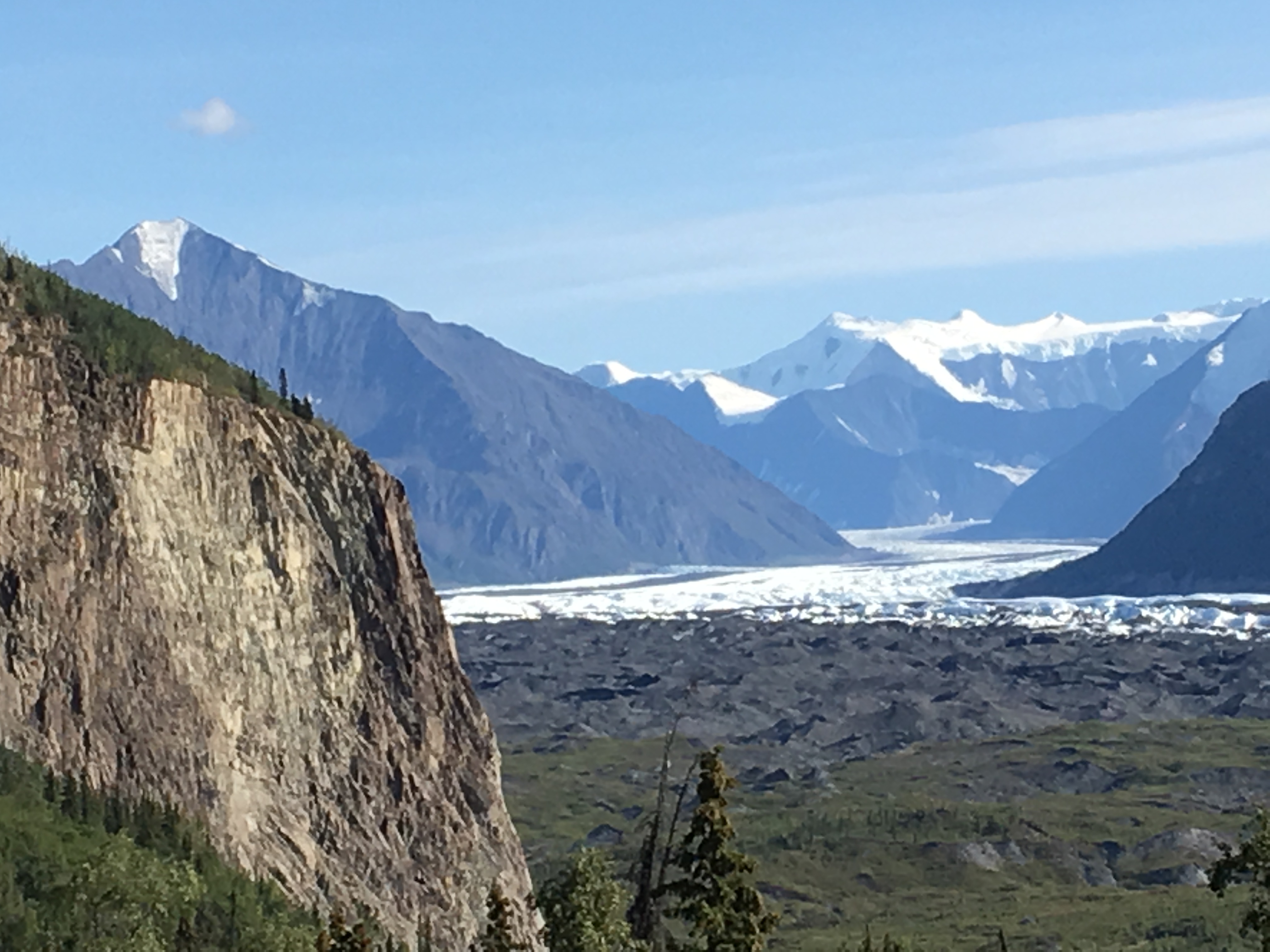 The Glenn Highway was as magnificent as we envisioned 8 years ago when we barely caught a glimpse. The road winds through the southern end of the Mat-Su Valley of steep pointed mountains and eventually leads to the Matanuska Glacier, the largest glacier in Alaska that can be reached by road. It is 26 miles long and 4 miles wide at its terminus. The glacier can be accessed via the privately owned Matanuska Glacier Park for a $20 fee, but can be seen from a close distance on the road.