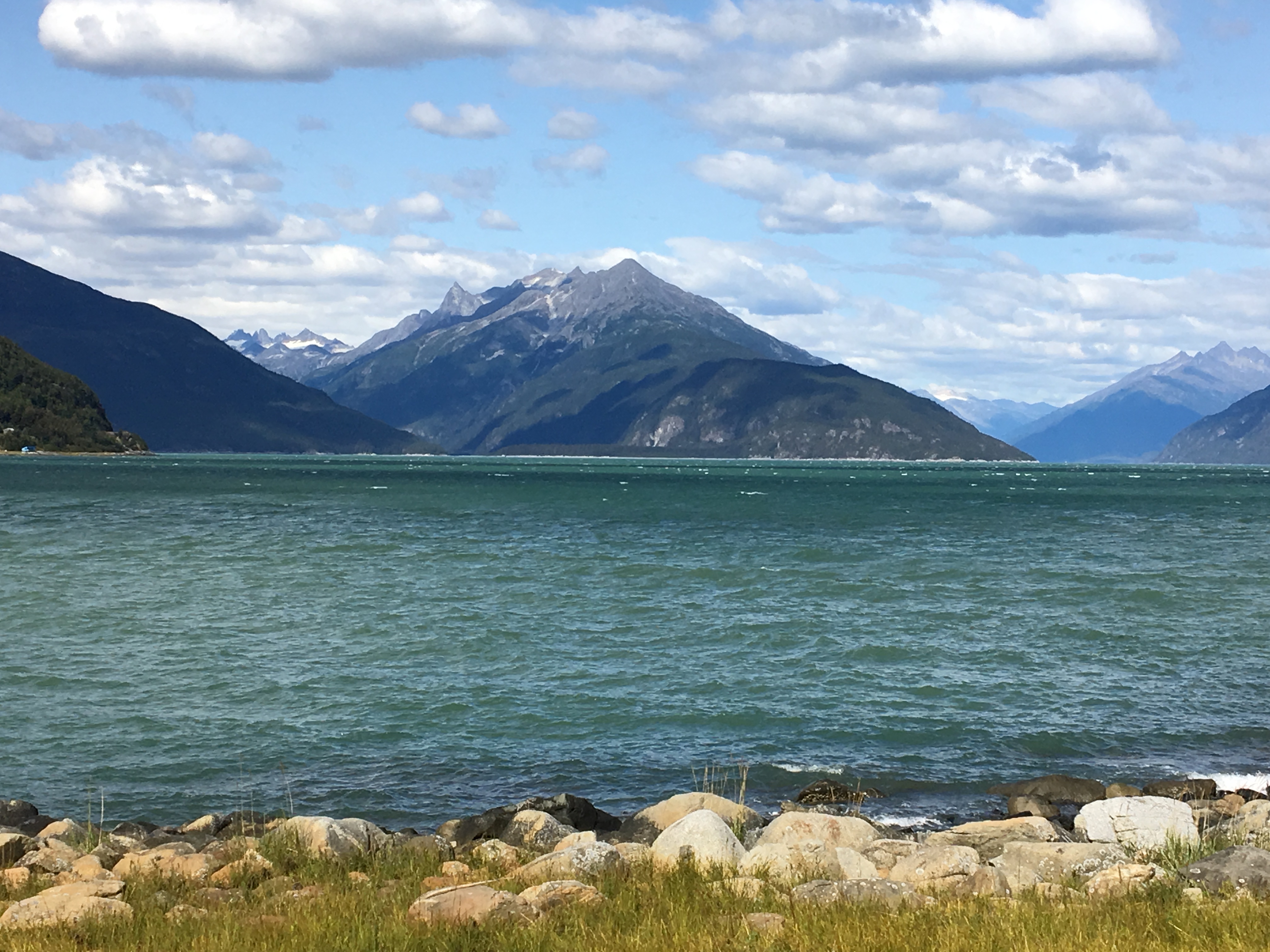 But the journey from Tok to Haines is a longer drive than we wanted for this day so we decided to revisit a remarkable campground that was enshrouded by low clouds, rain and fog almost four weeks ago hiding what we assumed were outstanding views of the Dawson Range. The Cottonwood RV Park at Destruction Bay is a gem of a park. The sites are close but sites along the water’s edge are very special. The Kluane Lake (pronounced Claw-knee) did provide the views we missed and more. We even discovered a glacial topped mountain that we weren’t even aware of last trip here. (High recommendation for the beauty, grandeur, panorama, quality and peacefulness of this location. To us, it proved very special twice and we’re already discussing how we might make this lake a destination in the future.)