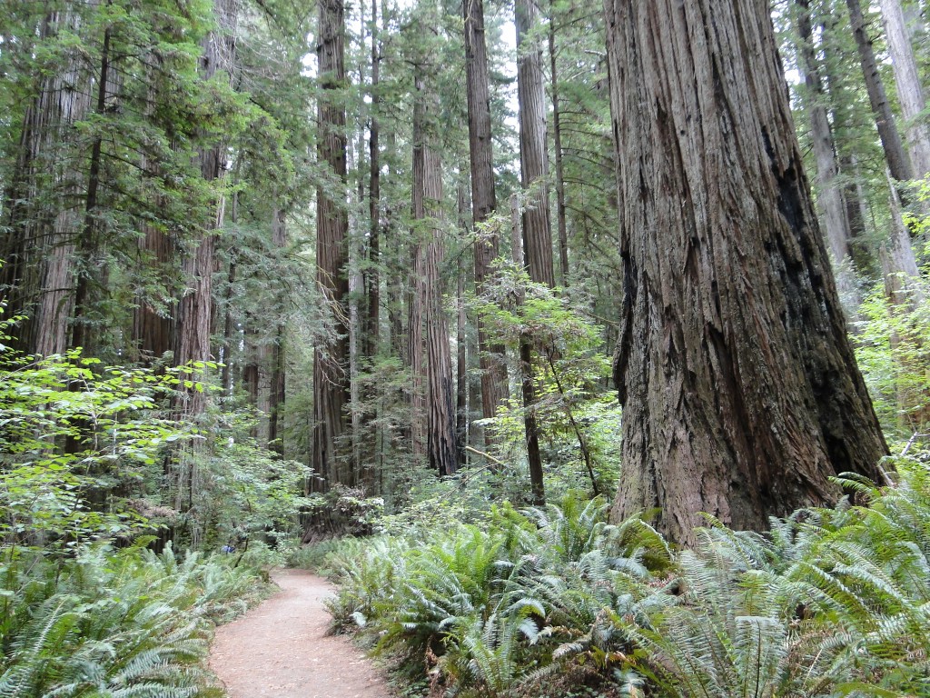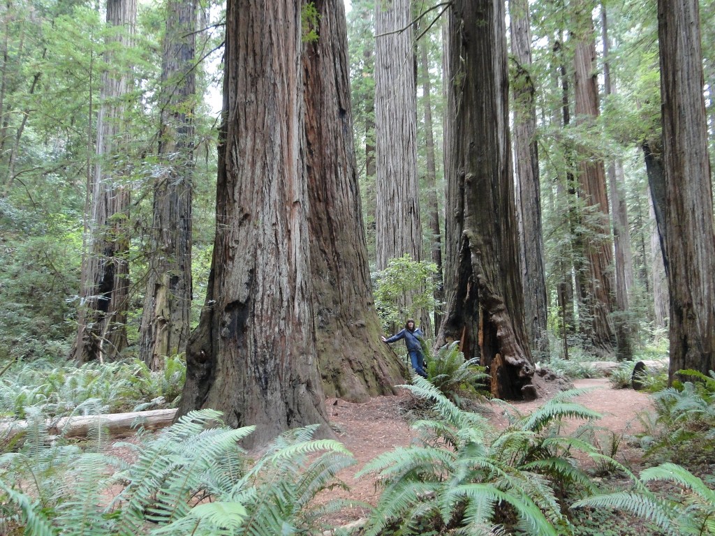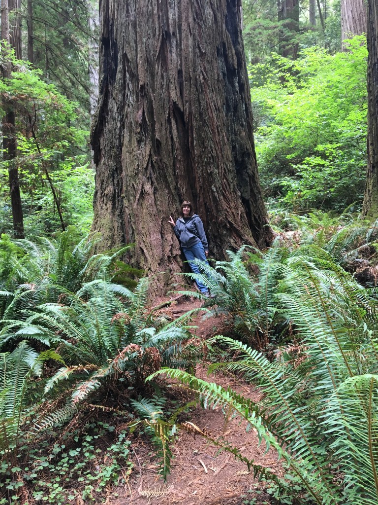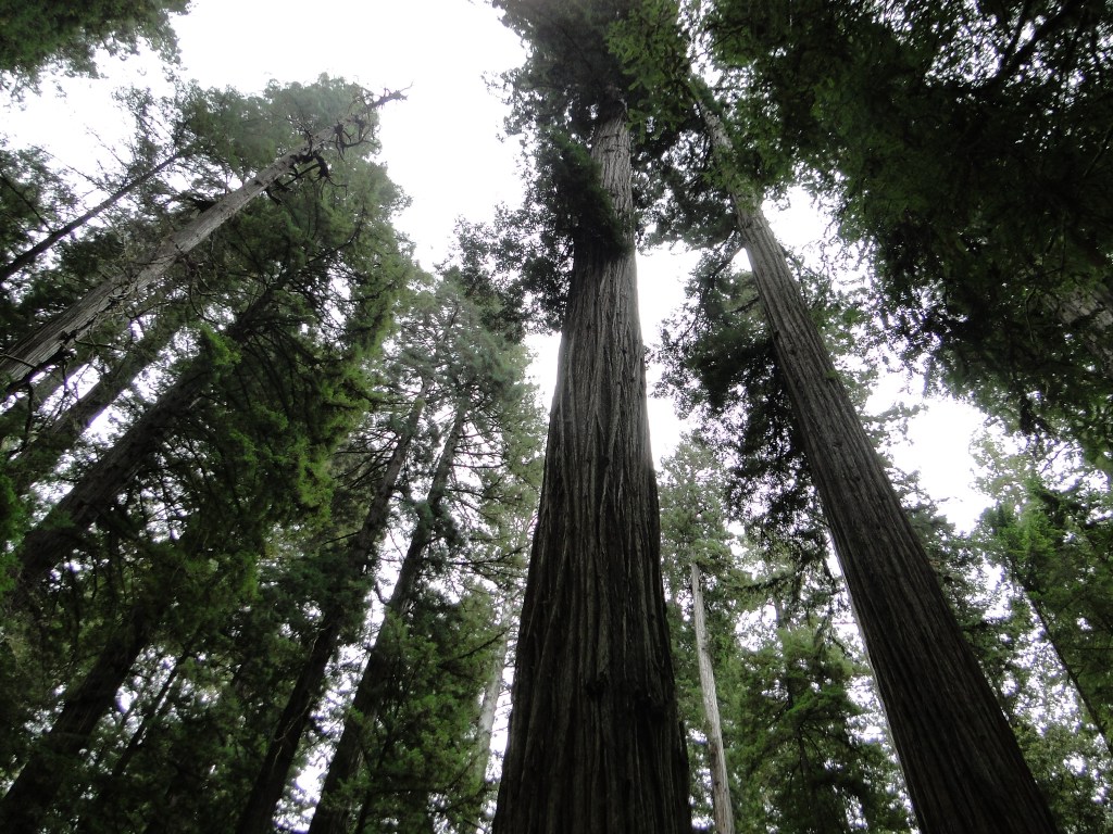 Continuing southbound the next day we are headed to the Redwoods just across the California border. The Redwoods National and State Parks include the Jedidiah Smith Redwood State Park, the Del Norte Coast Redwoods State Park, and Prairie Creek Redwoods State Park. Together as a World Heritage Site and an International Biosphere Reserve, the parks are a cooperative management effort by the National Park Service and the California Department of Parks and Recreation. Though you can spend days exploring and hiking through these ancient giants, we planned just to spend the one day here as we have been here before and we are heading to a rendezvous with some old friends at Yosemite Park. As always, we stop at a Visitor Center to help plan the most efficient use of our time. Since we are headed towards a campground in Gasquet, we stop at the Jedidiah Smith Visitor’s Center for hiking trail maps and advice. We had been reading about The Stout Grove at this area of the park and in fact did drive to that trail. The road into The Grove is quite narrow and becomes dirt shortly after exiting the main road, Rt. 199. The ranger had suggested that we could drive the entire length of this dirt road after hiking to the Stout Grove; however, another patron said that our vehicle was much too tall to negotiate this entire pathway.