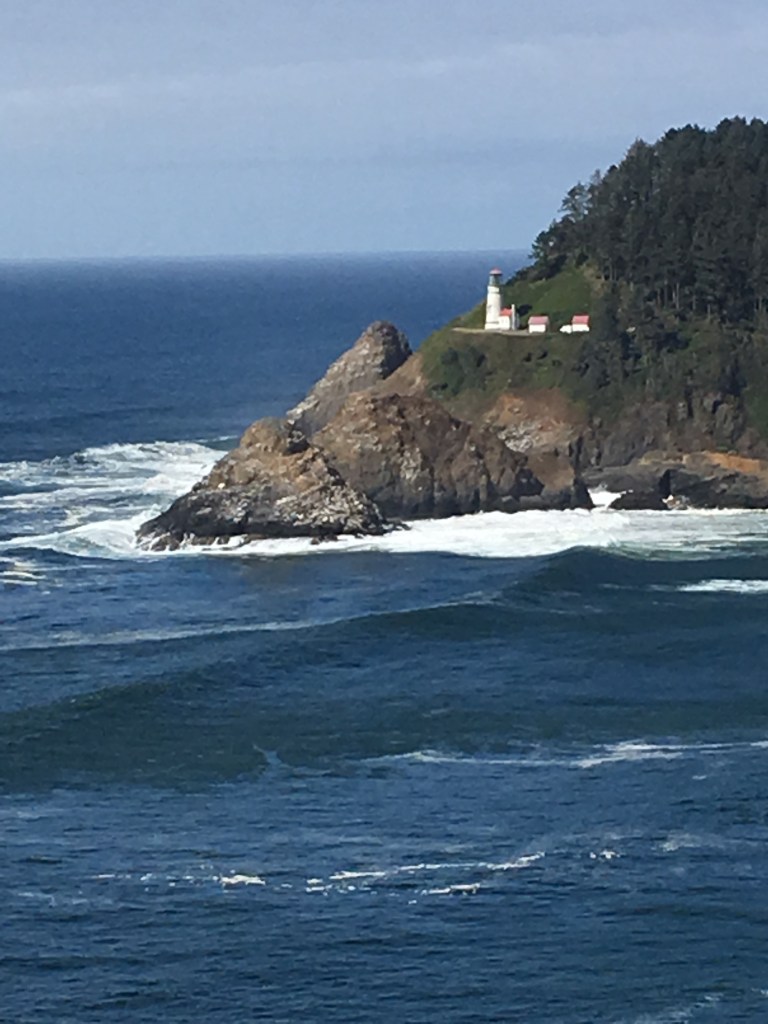 Leaving town heading west on Rt. 20, we quickly ascend the coastal range of the Siuslaw National Forest. We pass Mary’s Peak at 4,032 feet watching over Corvallis as we reach the Pacific Ocean in just over an hour and head south on Rt. 101, the coastal highway that follows the Pacific from Washington through California. Traveling the Oregon coast has been in our plans since this journey was initially planned and we are delighted to finally see the Pacific. We are headed for the Umpqua Lighthouse Campground, about a 3 hour drive from Corvallis but first visit a number of view points along the route. The coast is a varied array of steep mountain cliffs and tall sand dunes that skirt the coastline and offer hiking trails along with remarkable vistas. The sharp, verdant hills that drop quickly to the water remind us both of the north shore of Kauai, Hawaii.